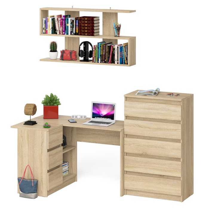 Угловой компьютерный стол Мори МС-16 левый с навесной полкой и высоким комодом на 5-ть ящиков (Дуб сонома) Код I0000450955