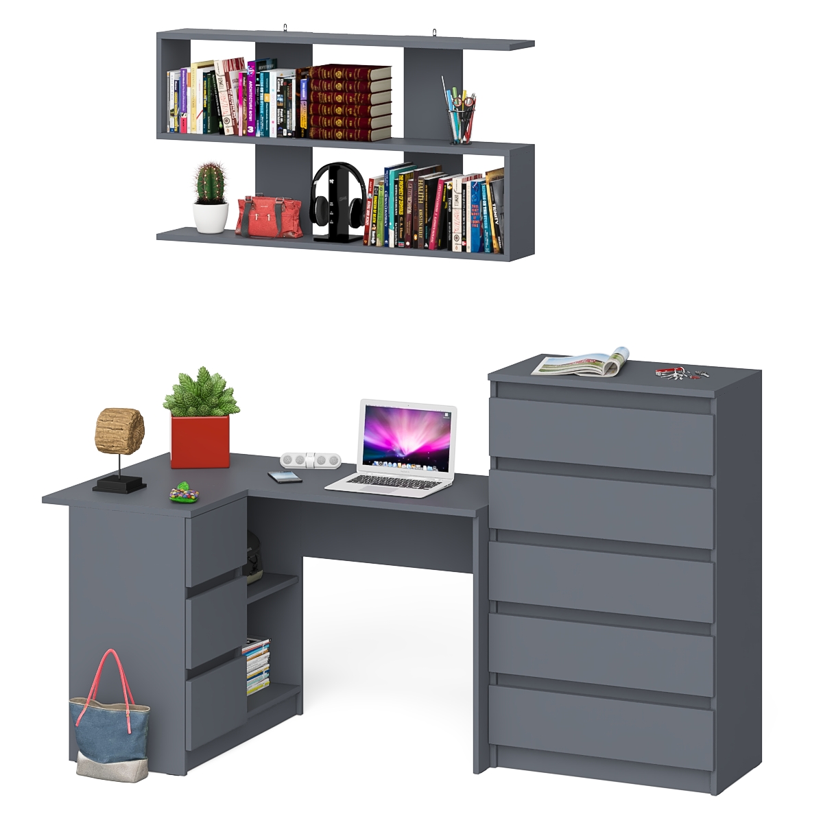 Отзывы о Столплит Угловой компьютерный стол Мори МС-16 левый с навесной полкой и высоким комодом на 5-ть ящиков Графит