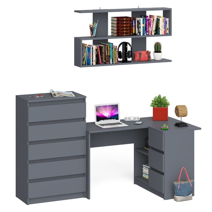 Комод Мори МК700.5 со столом компьютерным угловым МС-16 правым и открытой полкой 1200 - минималистичный дизайн и доступная цена позволяет наслаждаться качественной и современной мебелью без значительных финансовых затрат! Комплектация включает угловой компьютерный стол Мори МС-16 правый, узкий комод пять ящиков Мори МК700.5 и навесную полку Плк-1200.