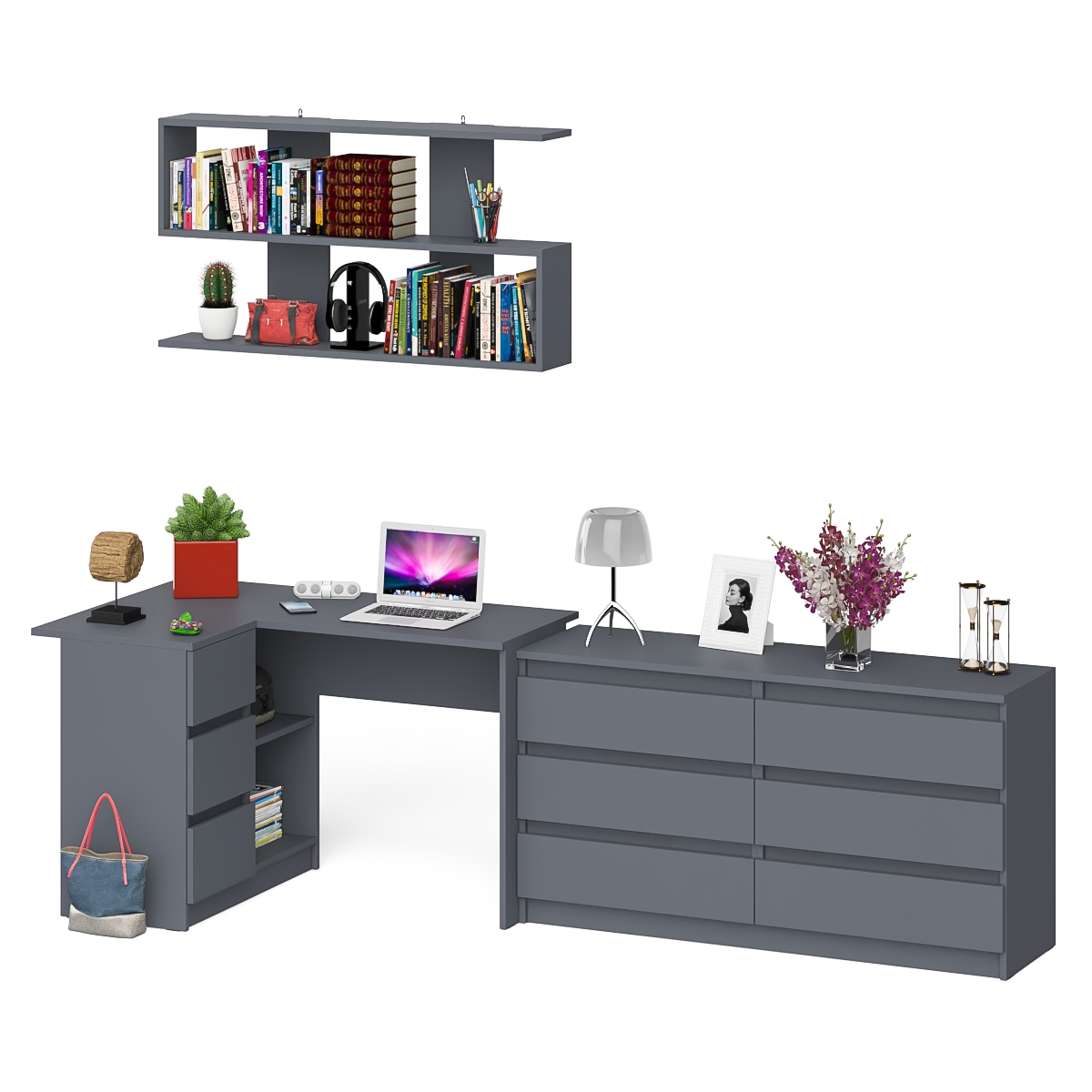 Стол угловой компьютерный Мори МС-16 левый с навесной книжной полкой и комодом МК1380.6 (Графит) Код I0000450973