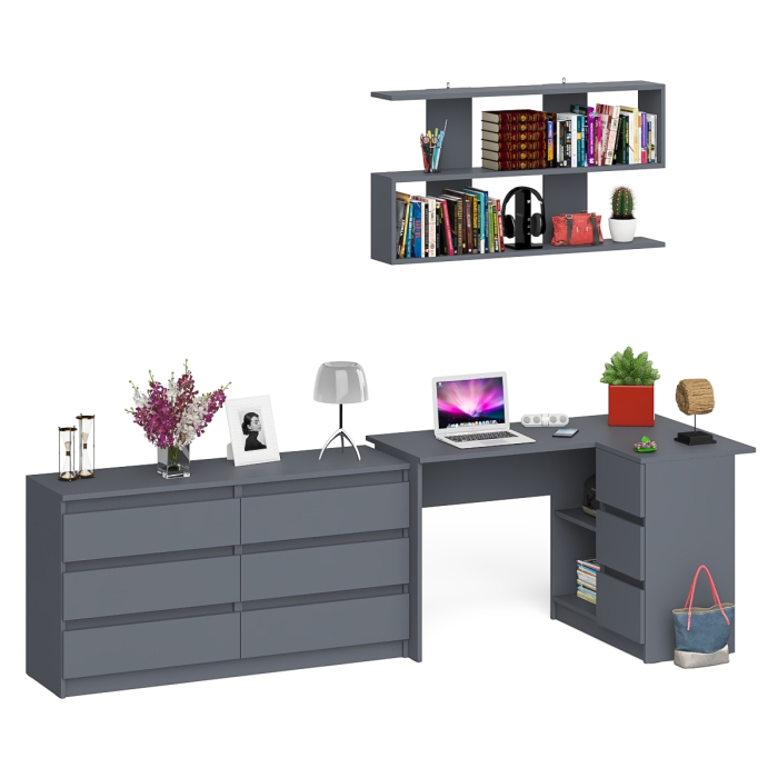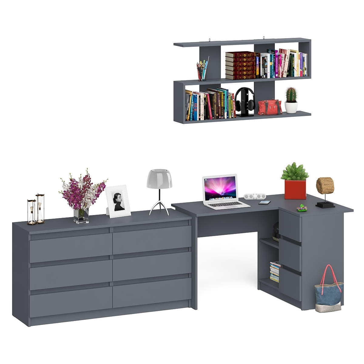 Комод широкий 6-ть ящиков Мори МК1380.6 с угловым компьютерным столом МС-16 правым и открытой книжной полкой (Графит) Код I0000450978