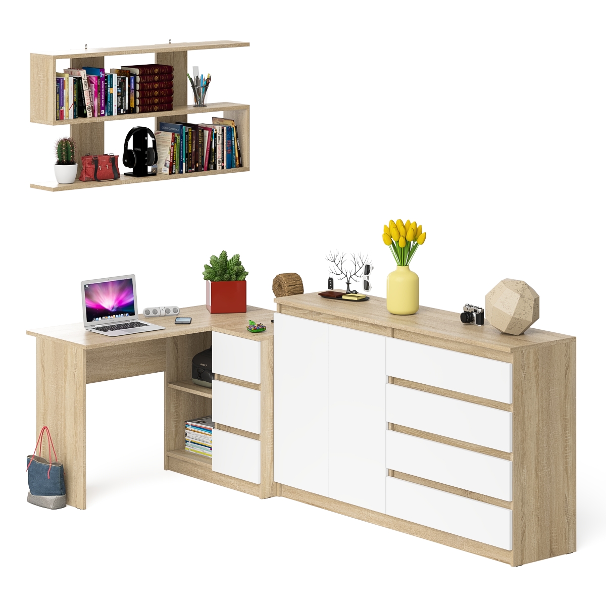 Отзывы о Столплит Тумба-комод МК1600.1 Мори с навесной книжной полкой и угловой компьютерный стол МС-16 правый Дуб Сонома, Белый