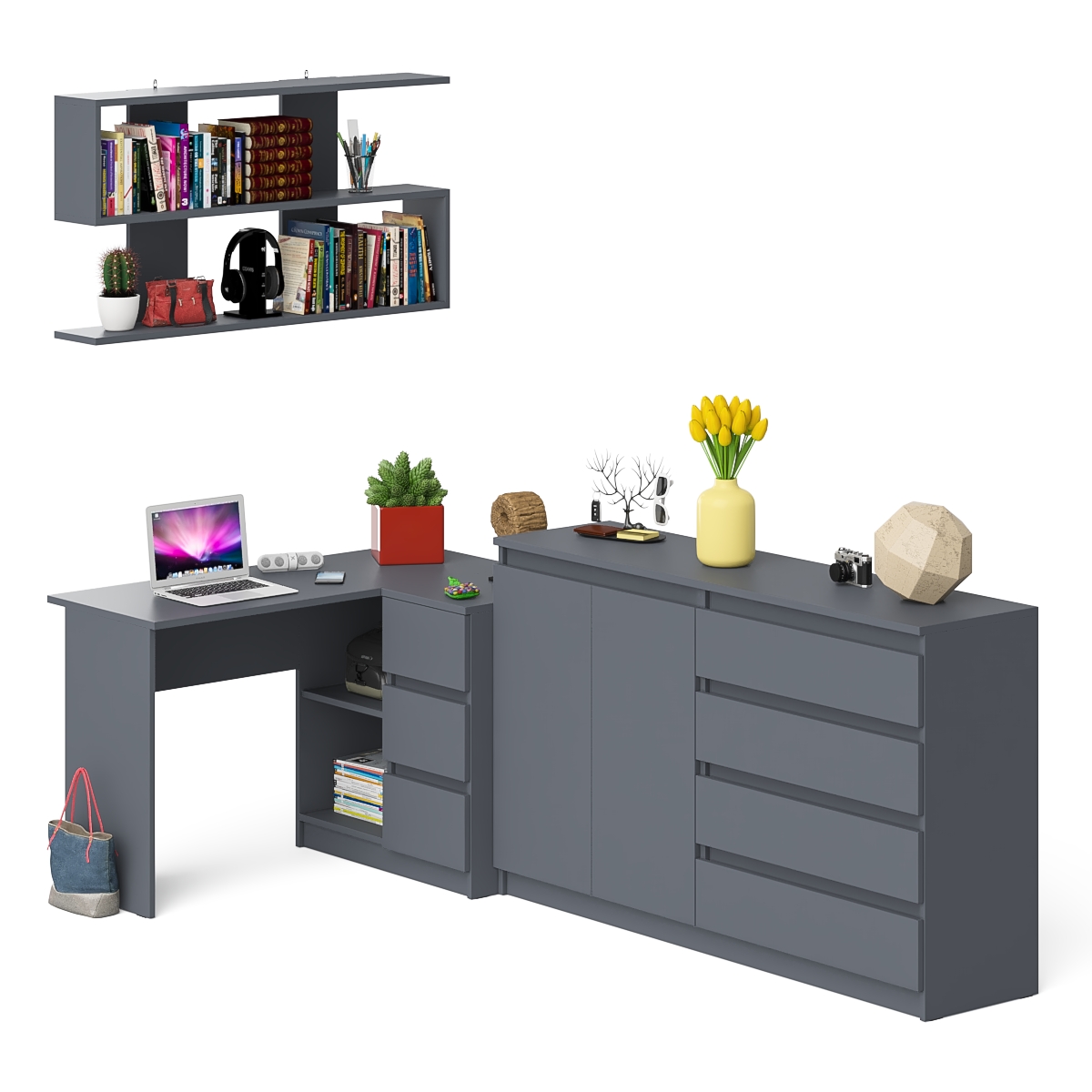 Отзывы о Столплит Тумба-комод МК1600.1 Мори с навесной книжной полкой и угловой компьютерный стол МС-16 правый Графит