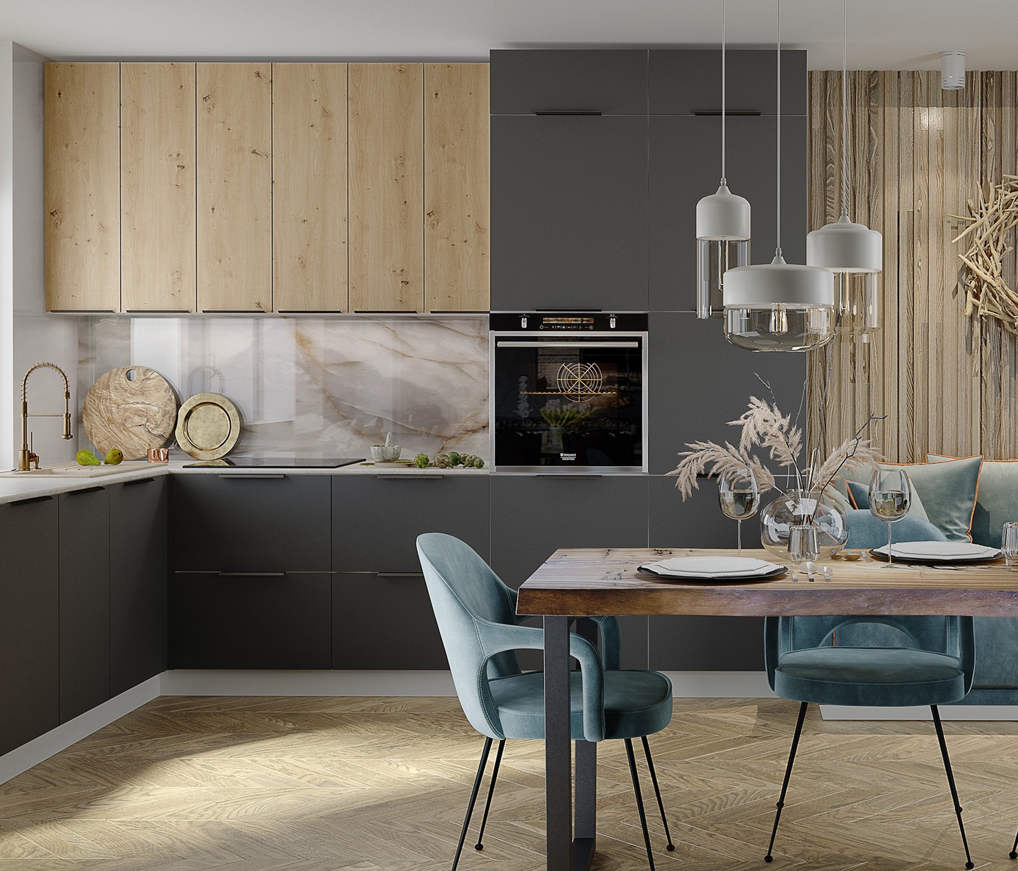 Корпус из 16 мм ЛДСП белого цвета создает прочную основу и гармонично сочетается с контрастной композицией фасадов