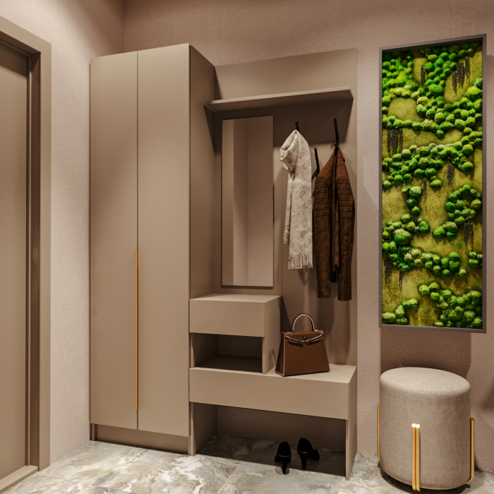 Прихожая выполнена полностью в бежевом цвете, что придает ей элегантный и современный вид.