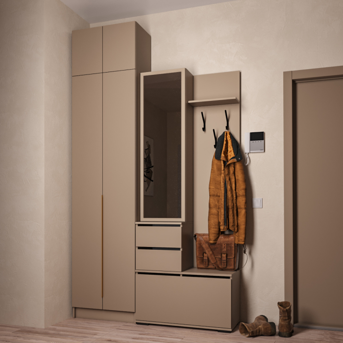 Прихожая выполнена полностью в бежевом цвете, что придает ей элегантный и современный вид.