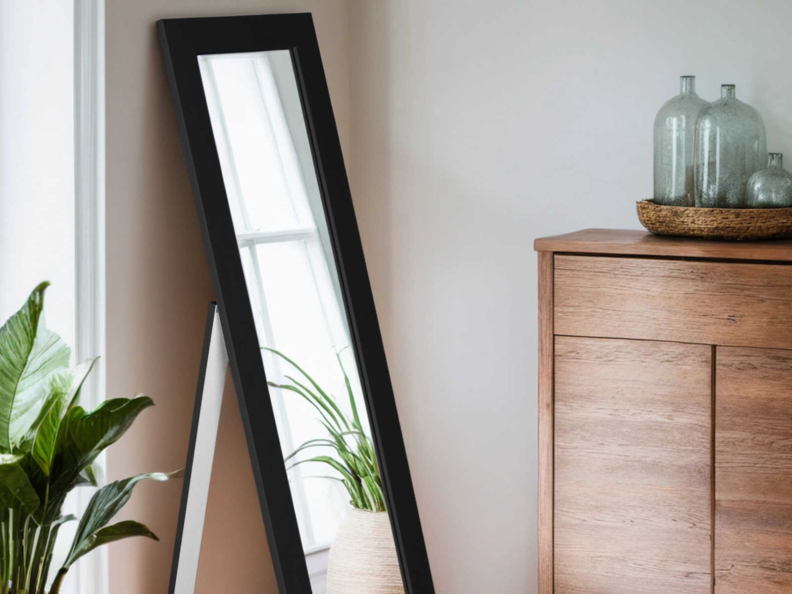 Практически всегда в небольшом офисе возникает необходимость поместить зеркало. Данная модель – идеально подойдет для решения этой задачи. Зеркало компактно – всего 35см шириной, не занимает много места, и при этом позволяет рассмотреть себя в полный рост в полном объеме за счет наклона полотна. Если у вас уж совсем нет места, то это зеркало можно повесить на стену. В зависимости от ваших предпочтений, вы можете выбрать один из цветов оформления – белый, или нейтральный черный. Оба цветовых варианта не акцентируют на себе внимания и не отвлекают от работы сотрудников. Эта модель так же будет полезной для новоселов, молодых семей, для использования во временном или съемном жилье. Необходимый практичный предмет интерьера любого пространства, не обременяющий бюджет и создающий комфортную обстановку. ___ Интерьерное зеркало в полный рост всегда украсит обстановку и станет местом притяжения гостей. Если площадь помещения небольшая, то лучшим вариантом станет зеркало напольное в раме на колесах с меняющимся углом наклона. Зеркало в раме можно использовать в разных помещениях, и как зеркало в прихожую, коридор, гардеробную, гостиную, спальню. Если вы выбираете зеркало в ванную, обратите внимание на материалы рамы, они должны быть влагостойкими. Актуально в раму зеркала встраивать подсветку, чтобы было удобнее наносить макияж. Специфические характеристики и декор важны, если зеркало подбирается в общественные помещения. Тандем из зеркала и туалетного столика - мини салон красоты у вас дома.