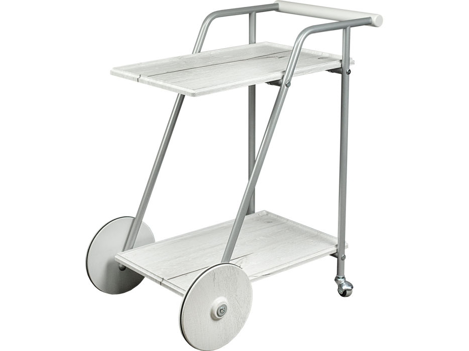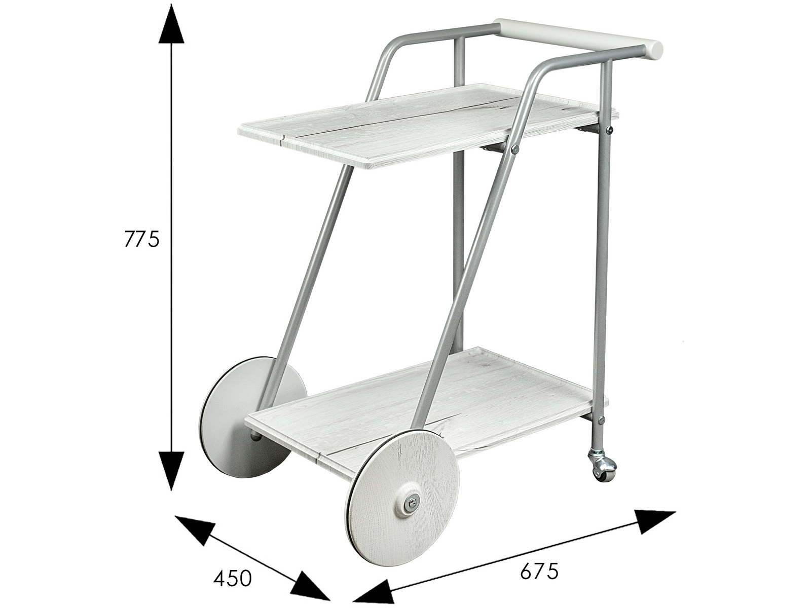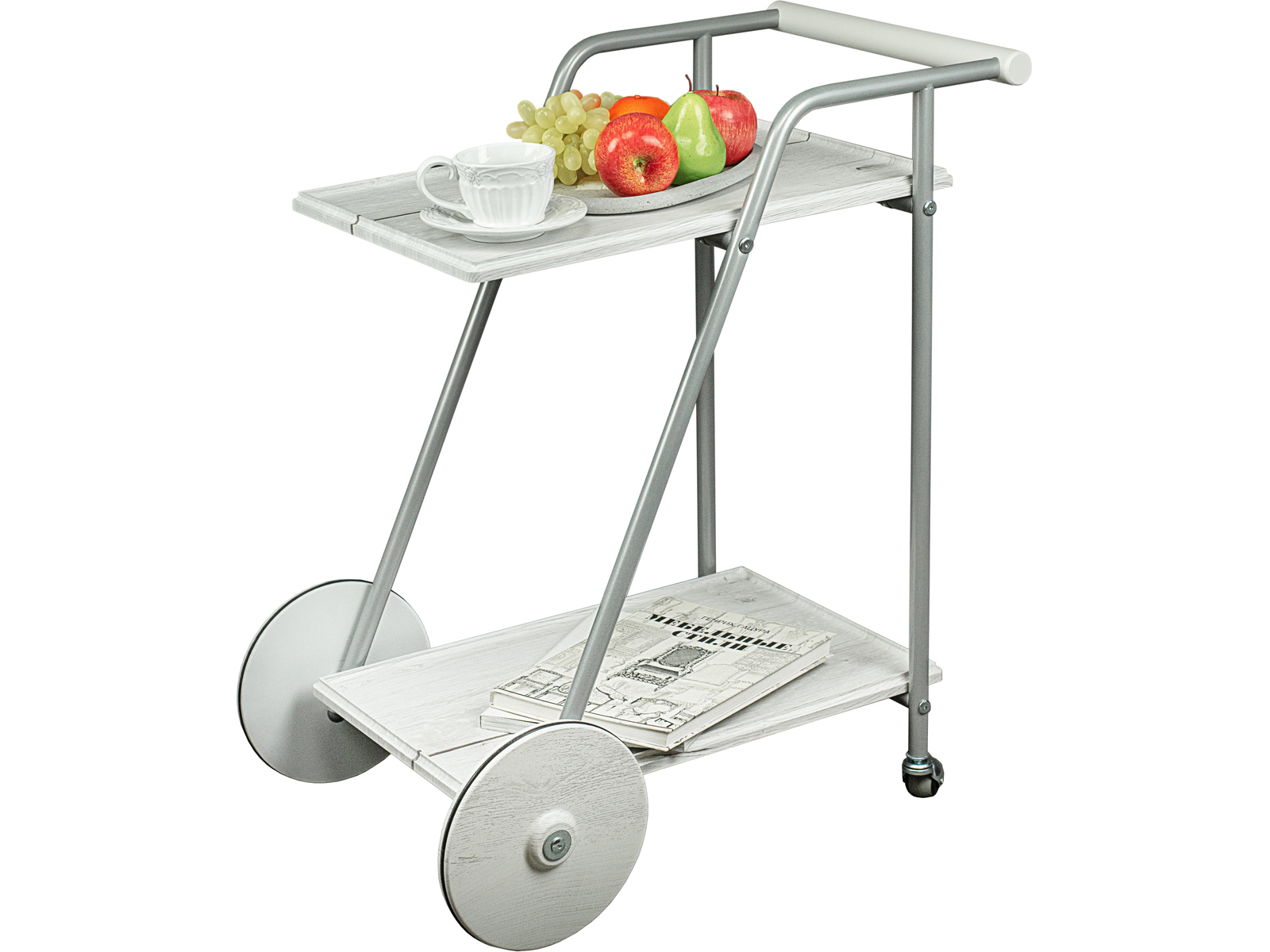 Сервировочный столик Оди добавит яркий акцент в интерьер квартиры или дома. Металлический каркас обеспечит прочность и устойчивость, а деревянная столешница из МДФ, покрытого плёнкой, гарантирует долгий срок службы. Главной особенностью изделия является сочетание больших и маленьких колёсиков. Удобная ручка позволяет с легкостью перемещать столик по комнате. Функциональный предмет мебели со съемным подносом подойдет для сервировки завтрака или для вечернего чаепития в спальне или гостиной.