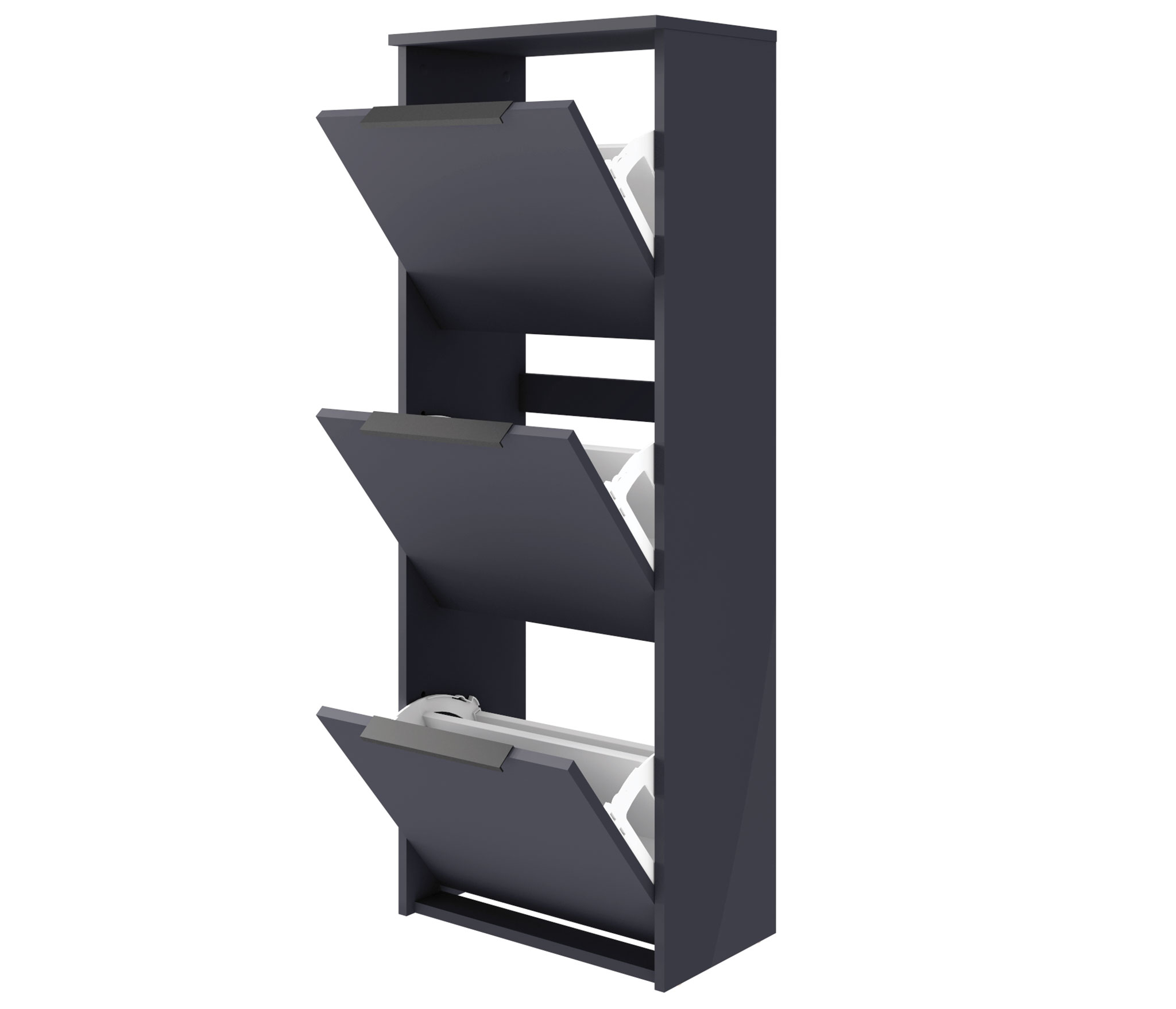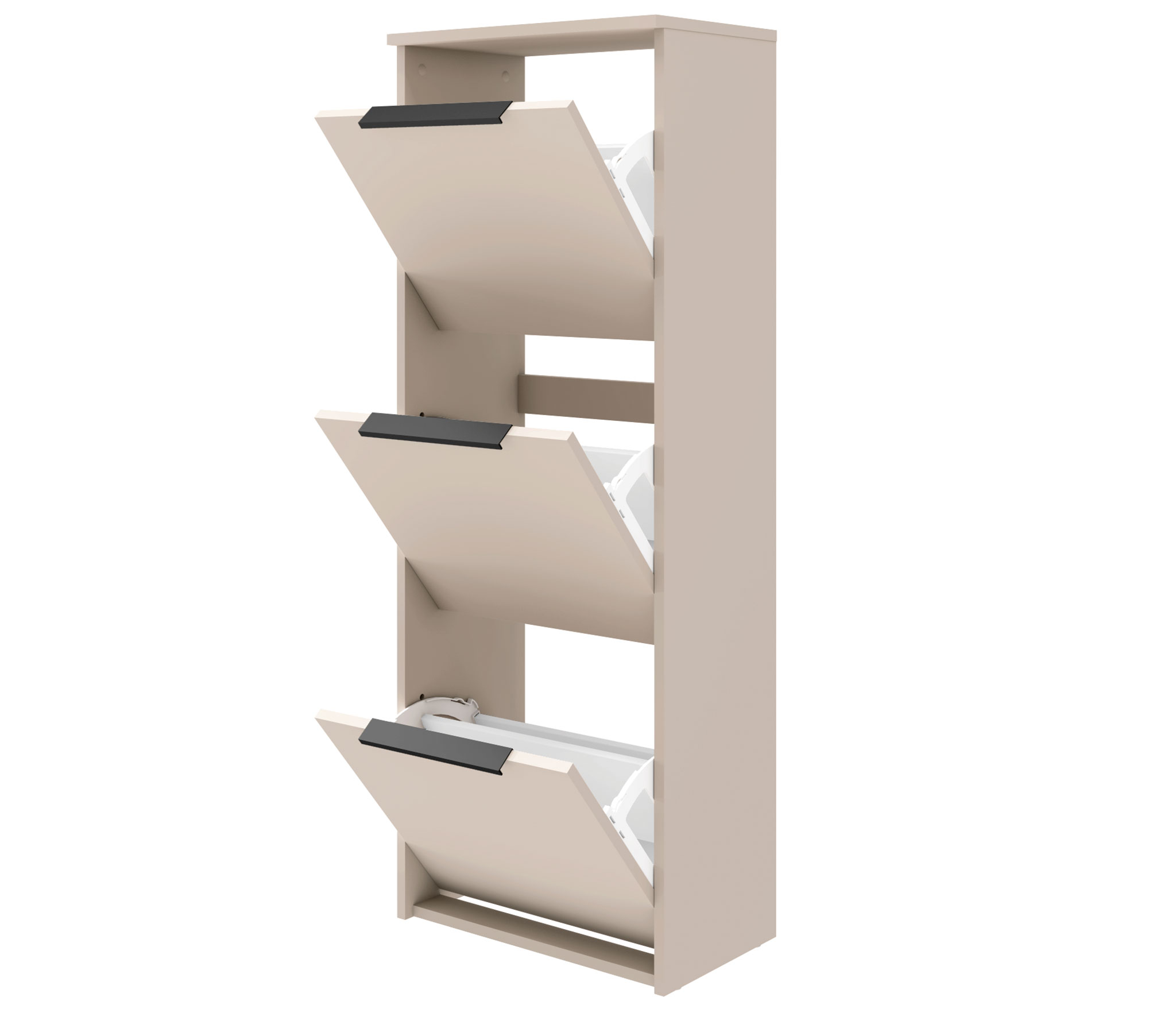 Обувница оснащена тремя откидными фасадами, за каждым из которых расположены отделения для хранения пар. Такая конструкция позволяет удобно размещать повседневную обувь всей семьи, быстро находить нужную пару и при этом скрывать её от глаз.