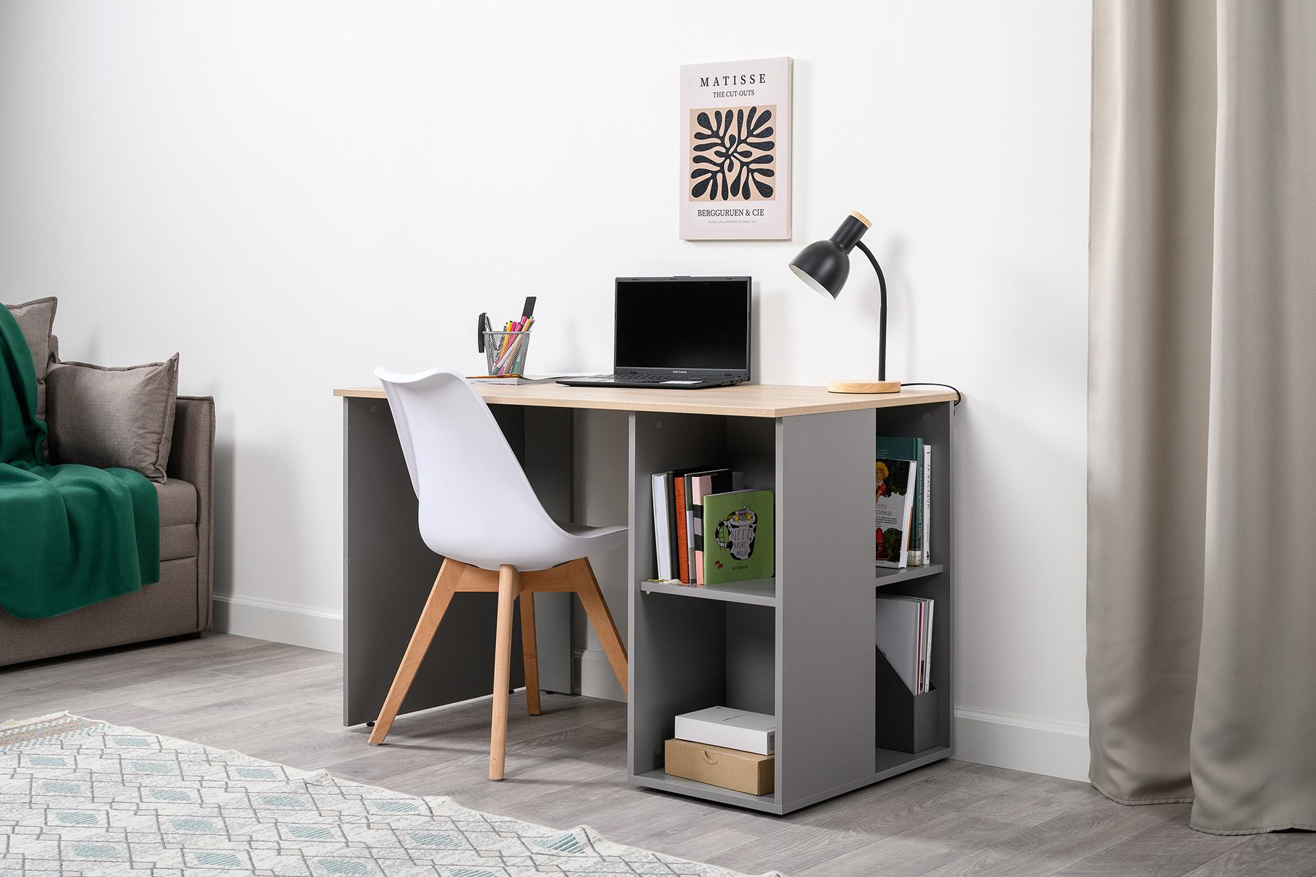 Стол оснащён широкой столешницей 120х65 см и тумбой с открытыми полками, где удобно хранить книги, тетради, канцелярские принадлежности и повседневные аксессуары. Функциональная конструкция обеспечивает комфорт при работе за ноутбуком, выполнении домашних заданий или занятиях творчеством. Универсальная сборка позволяет устанавливать тумбу справа или слева, адаптируя стол под планировку помещения.