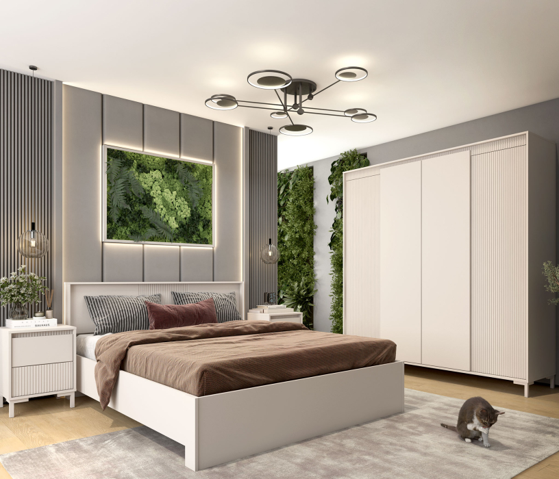 Гарнитур обеспечивает полный набор мест хранения и удобную зону отдыха: вместительный четырёхдверный шкаф для одежды и текстиля, удобную кровать и пару прикроватных тумб для самых нужных мелочей.