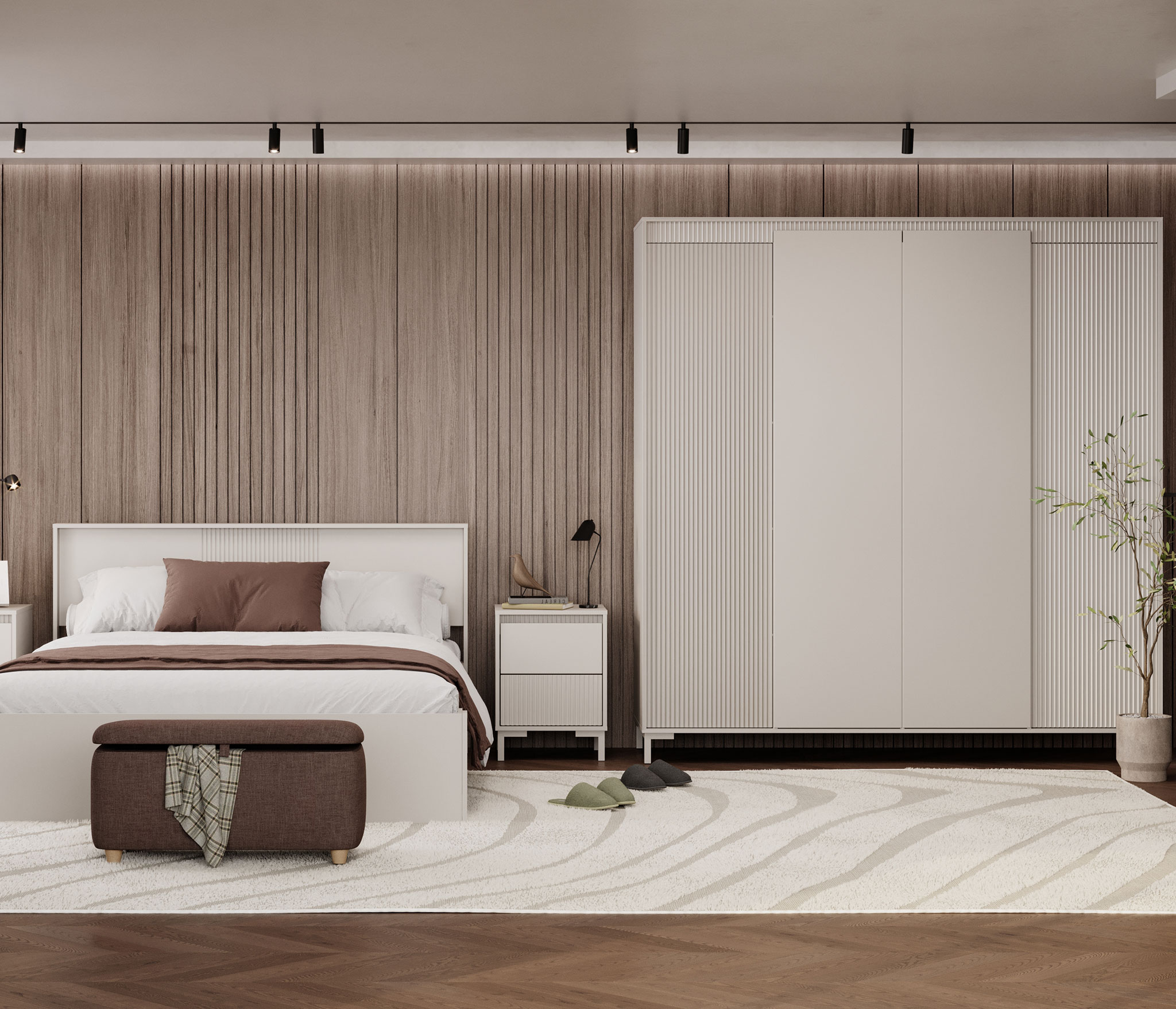Гарнитур обеспечивает полный набор мест хранения и удобную зону отдыха: вместительный четырёхдверный шкаф для одежды и текстиля, удобную кровать и пару прикроватных тумб для самых нужных мелочей.