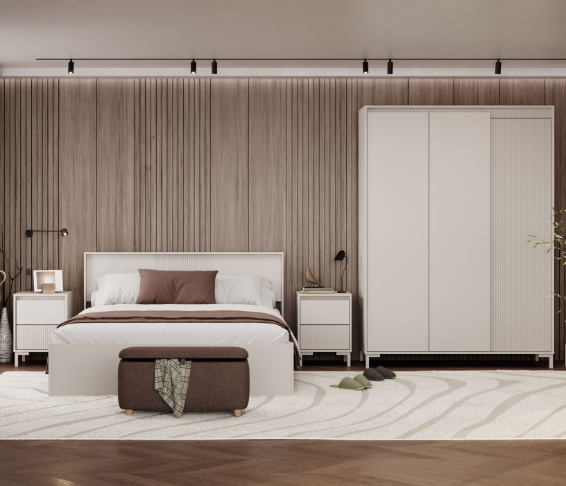 Гарнитур обеспечивает полный набор мест хранения и удобную зону отдыха: вместительный трехдверный шкаф для одежды и текстиля, удобную кровать и пару прикроватных тумб для самых нужных мелочей.