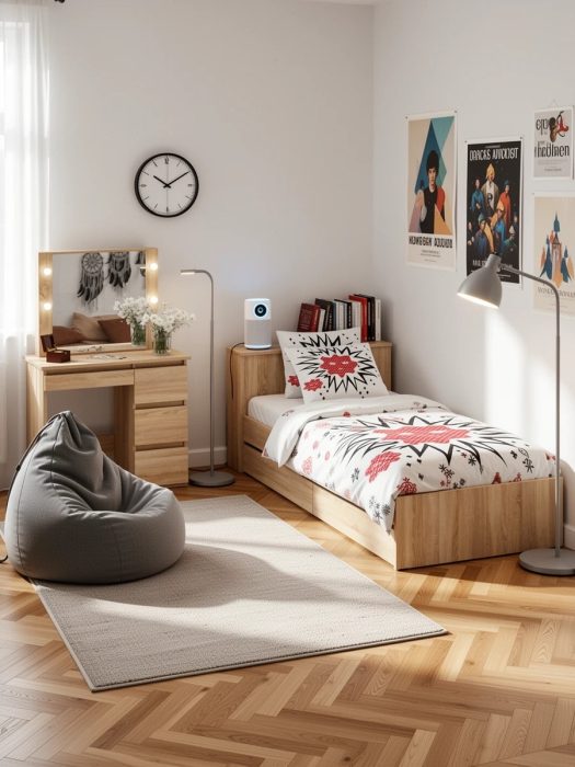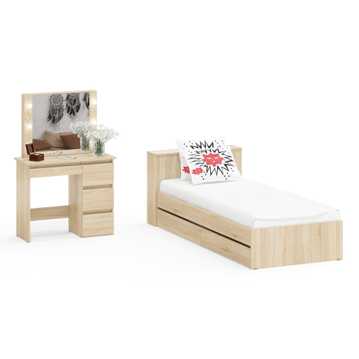 Кровать с ящиками Ксения 900 и столик косметический с подсветкой Сура. Комплектация состоит из кровати с выдвижными ящиками и косметического столика с подсветкой.