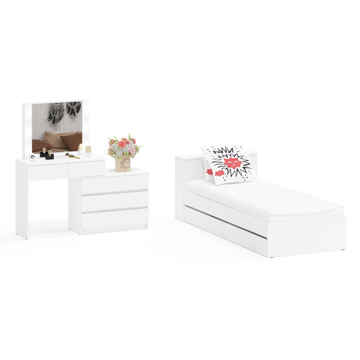Комплектация состоит из кровати с выдвижными ящиками и косметического стола с подсветкой. Кровать имеет односпальное место 900х2000 мм с прочным основанием в комплекте. Матрас приобретается отдельно. В основании кровати два ящика на роликовых направляющих, которые обеспечивают легкое выдвижение. В изголовье предусмотрена ниша с откидной дверкой, которая отлично подойдет для хранения. Кровать имеет универсальную сборку, что позволяет расположить выдвижные ящики как с левой, так и с правой стороны. Фасады ящиков выполнены без ручек – удобные выемки обеспечивают простоту использования.