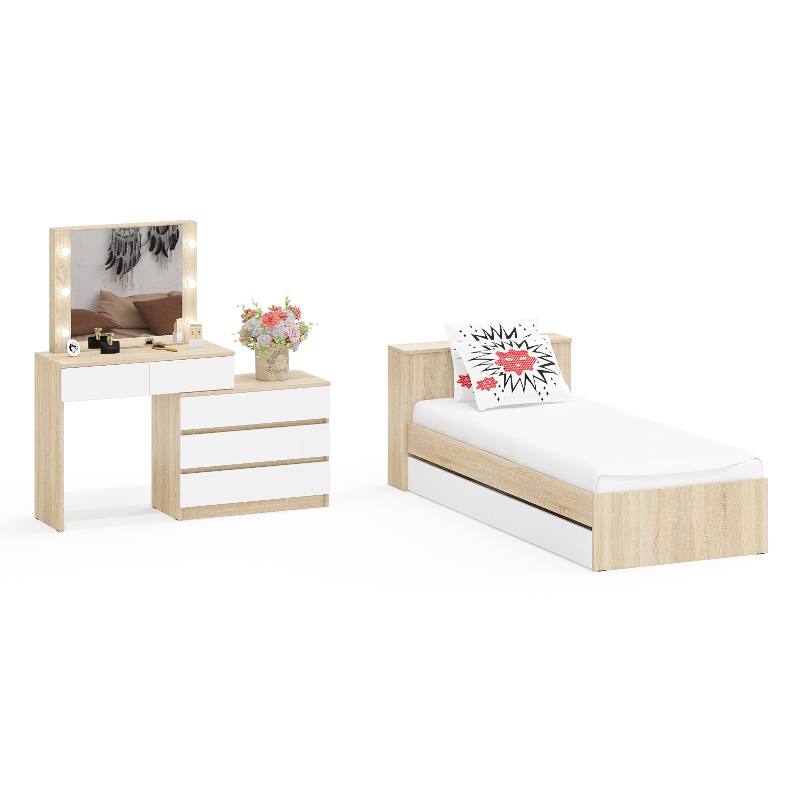 Стол косметический с подсветкой 110 с кроватью с выдвижными ящиками Ксения 900. Комплект подойдёт как для детской комнаты, так и для небольшой спальни, обеспечивая комфортный отдых и удобную зону ухода.