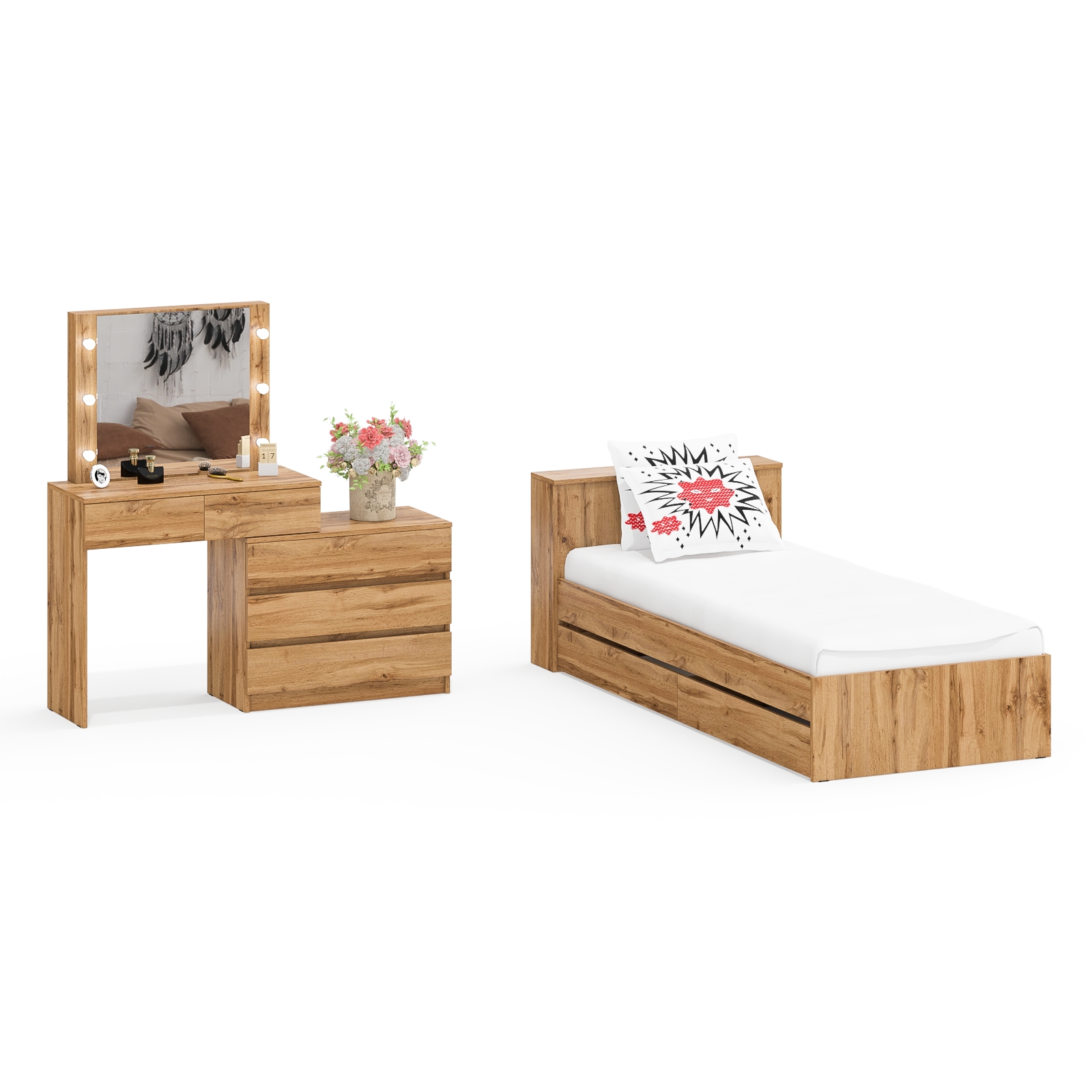 Комплектация состоит из кровати с выдвижными ящиками и косметического стола с подсветкой. Кровать имеет односпальное место 900х2000 мм с прочным основанием в комплекте. Матрас приобретается отдельно. В основании кровати два ящика на роликовых направляющих, которые обеспечивают легкое выдвижение. В изголовье предусмотрена ниша с откидной дверкой, которая отлично подойдет для хранения. Кровать имеет универсальную сборку, что позволяет расположить выдвижные ящики как с левой, так и с правой стороны. Фасады ящиков выполнены без ручек – удобные выемки обеспечивают простоту использования.
