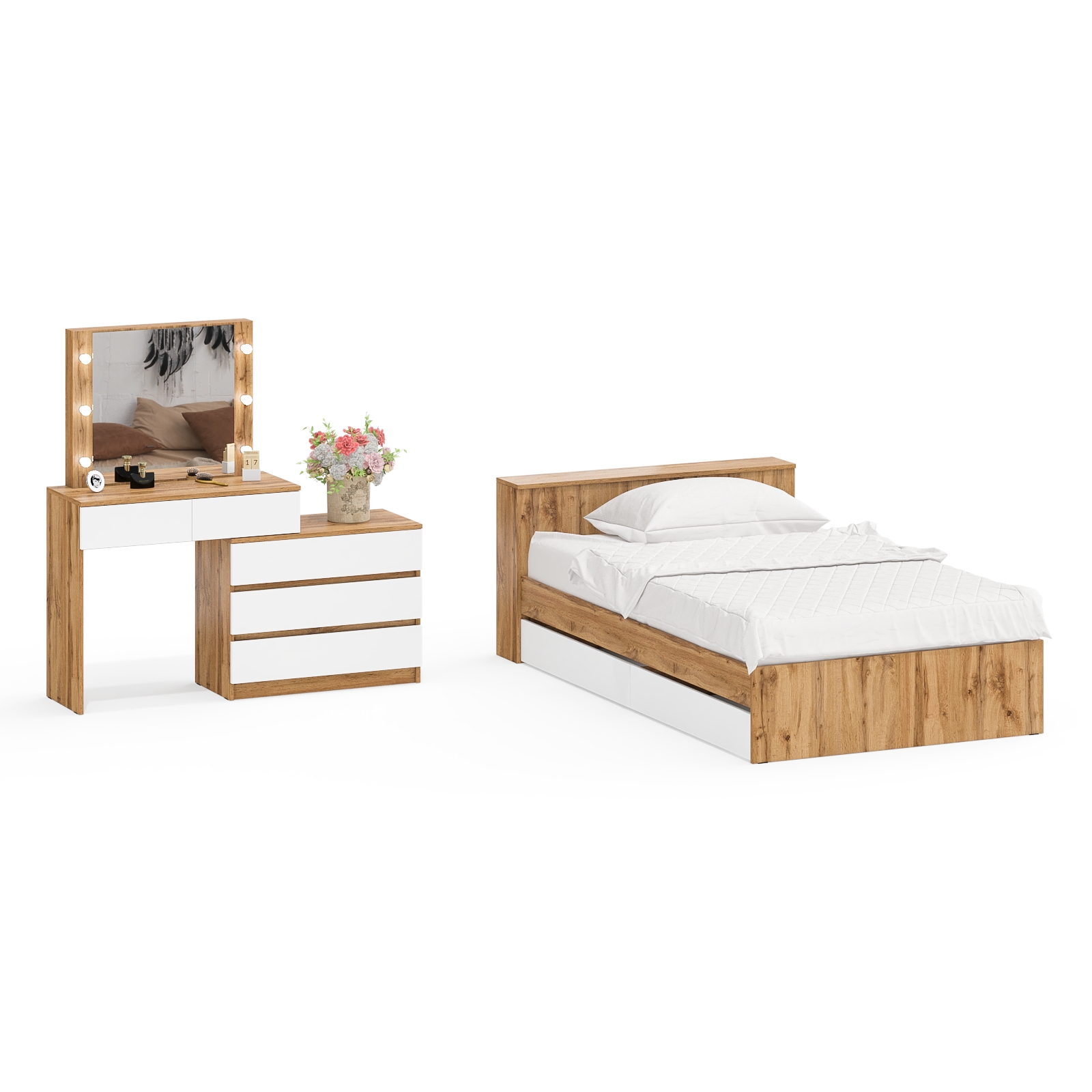 Столик туалетный с лампочками 110 с полутораспальной кроватью с ящиками Ксения 1200. Комплект подойдёт как для детской комнаты, так и для небольшой спальни, обеспечивая комфортное использование. Комплектация состоит из односпальной кровати с выдвижными ящиками и туалетного столика с лампочками.