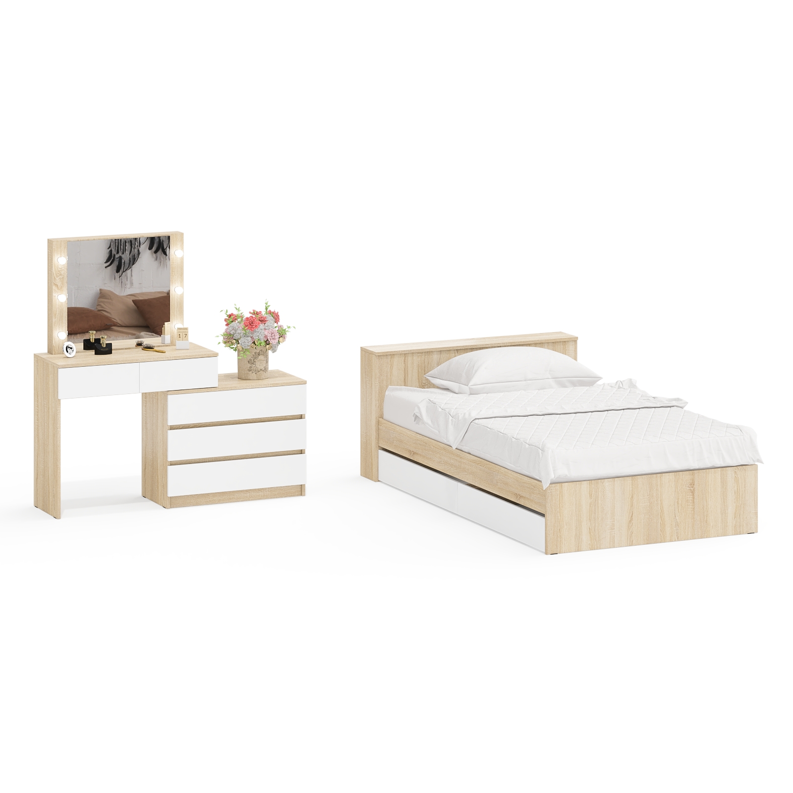 Отзывы о Столплит Столик туалетный с лампочками 110 с полутораспальной кроватью с ящиками Ксения 1200 Дуб Сонома, Белый