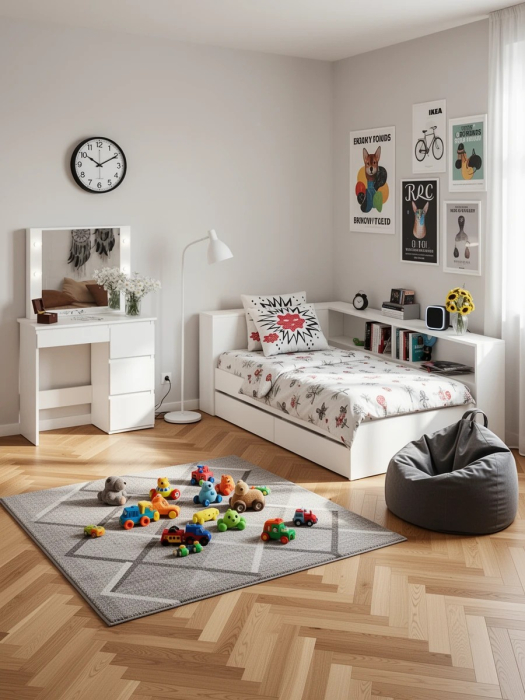 Кровать с ящиками с прикроватным блоком для вещей Ксения 900 и столик косметический с подсветкой Сура. Комплектация состоит из кровати с выдвижными ящиками, прикроватного блока для хранения вещей и косметического столика с подсветкой.