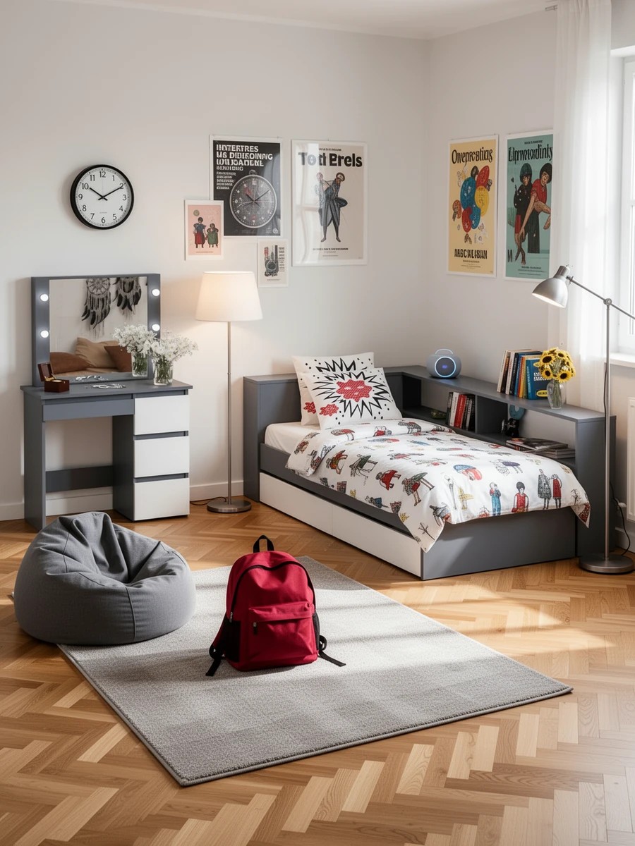 Кровать с ящиками с прикроватным блоком для вещей Ксения 900 и столик косметический с подсветкой Сура (Графит/Белый) Код I0000452059