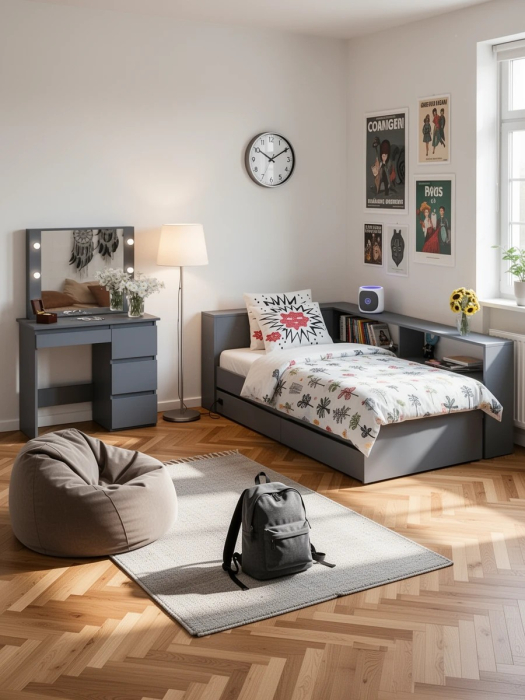 Кровать с ящиками с прикроватным блоком для вещей Ксения 900 и столик косметический с подсветкой Сура (Графит) Код I0000452058