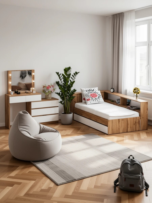 Столик косметический с лампочками 110 и Ксения 900 односпальная кровать с ящиками и прикроватным блоком. Комплектация состоит из столика с лампочками и односпальной кровати с выдвижными ящиками и прикроватным блоком.