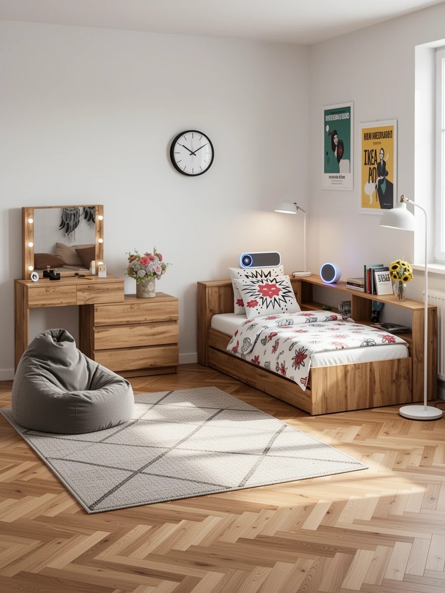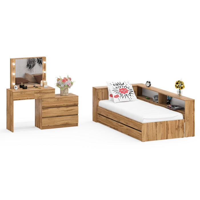 Столик косметический с лампочками 110 и Ксения 900 односпальная кровать с ящиками и прикроватным блоком. Комплектация состоит из столика с лампочками и односпальной кровати с выдвижными ящиками и прикроватным блоком.