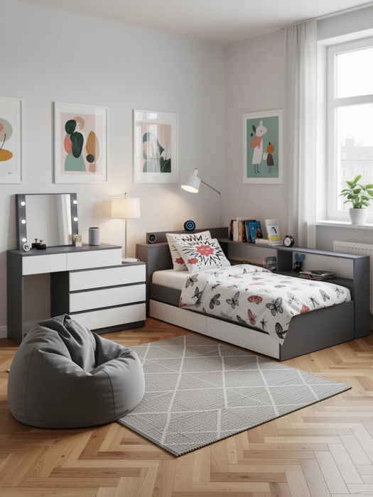 Отзывы о Столплит Столик косметический с лампочками 110 и Ксения 900 односпальная кровать с ящиками и прикроватным блоком Графит/Белый