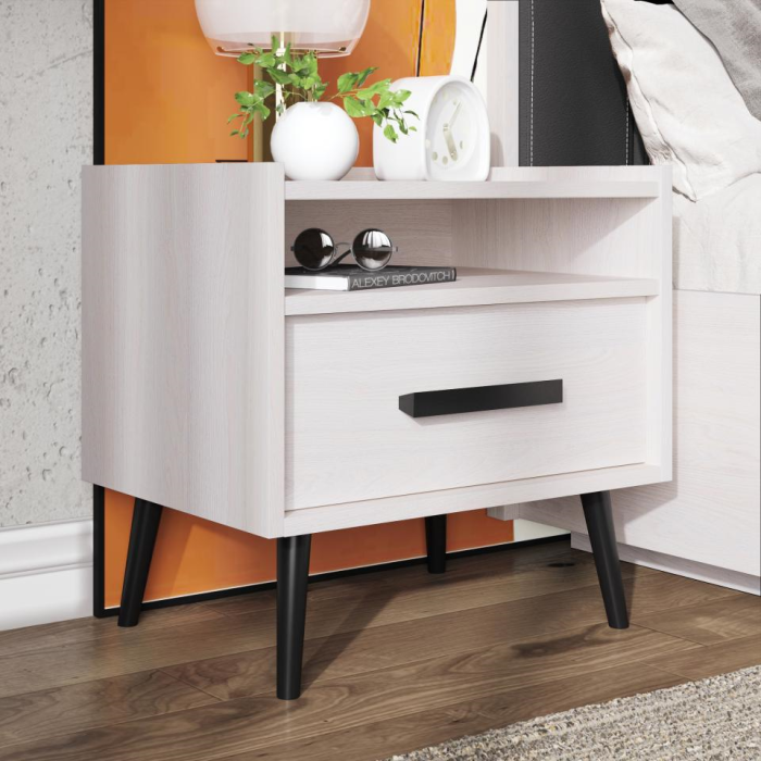 Элегантная и легкая тумба прикроватная 41 с 1-им выдвижным ящиком станет прекрасным дополнением к кровати коллекции Nature. Аккуратные черные опоры и ручки тумбы прикроватной выполнены из массива дерева. Они подчеркнут естественную красоту древесного декора и добавят мебели роскоши и «характера».