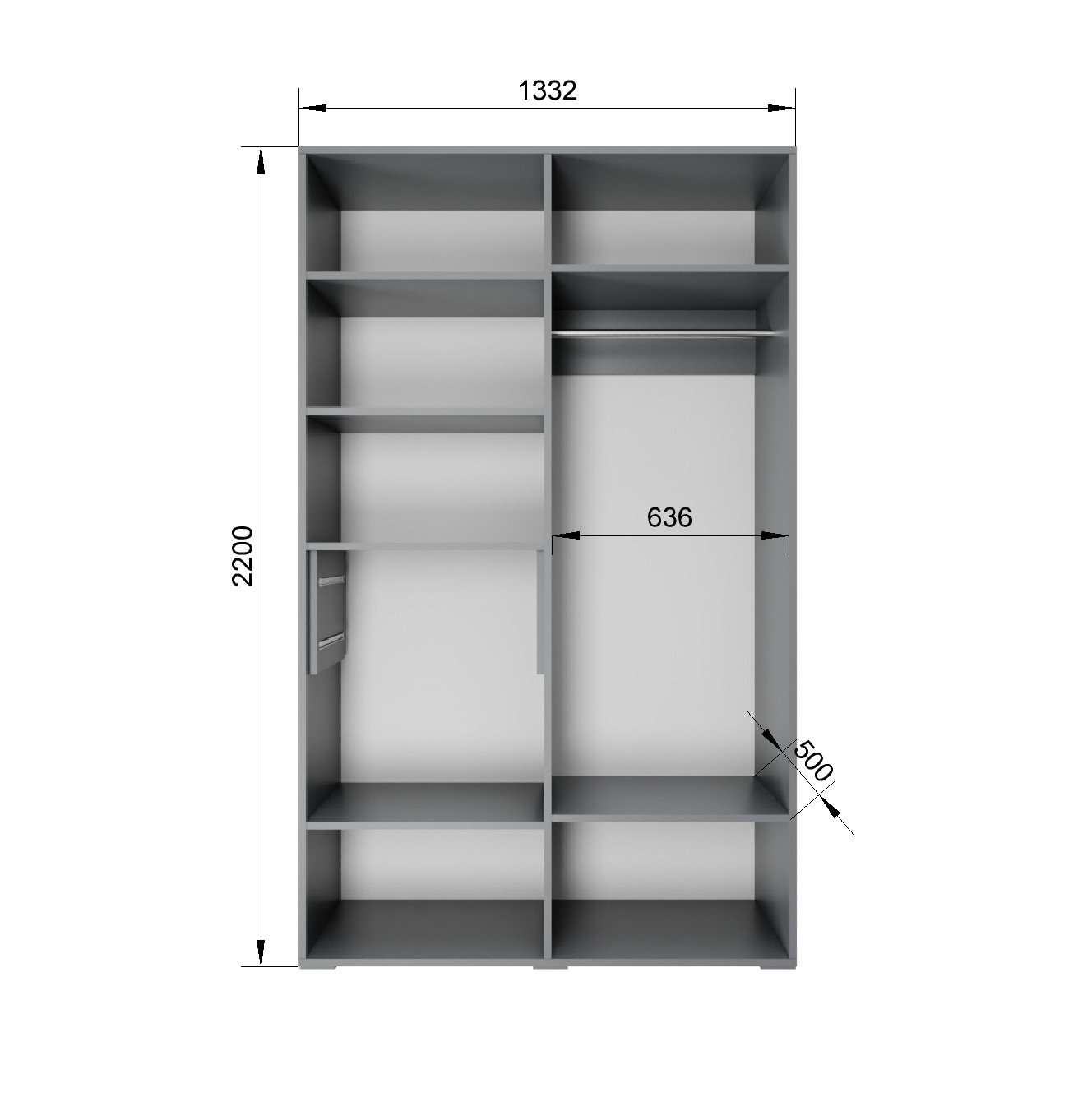 Этот вместительный распашной шкаф с габаритами 133,2х220×50 см предлагает оптимальное сочетание элегантного дизайна и практичной функциональности.