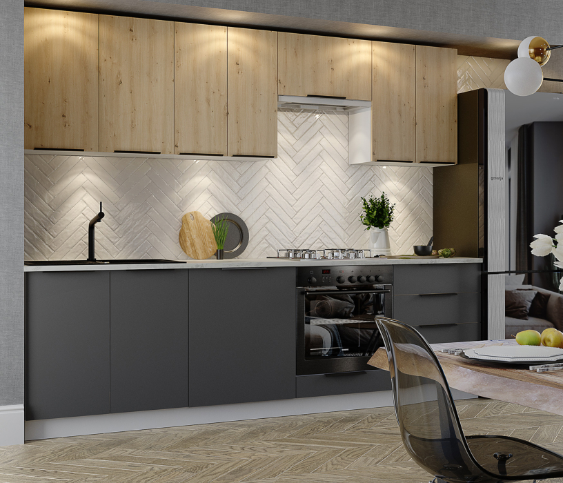 Модульная система Калипсо представляет собой органичное сочетание современной эстетики и природной теплоты. Длина данного исполнения 2,6 метра обеспечивает идеальный баланс между функциональностью и рациональным использованием пространства. Размеры 260×215×57,6 см позволяют организовать полноценную кухонную зону, удобную для повседневного использования и семейных кулинарных экспериментов. Модульная система спроектирована с учетом современных требований к функциональности и долговечности: • Корпус из 16 мм ЛДСП белого цвета создает надежную основу и нейтральный фон, подчеркивающий выразительность фасадов • Длина 2,6 метра позволяет организовать эргономичное рабочее пространство с соблюдением принципа «рабочего треугольника», обеспечивая оптимальное расстояние между зонами хранения, мойки и приготовления пищи Надежная фурнитура для повседневного комфорта Качество фурнитуры во многом определяет удобство эксплуатации и долговечность всей конструкции: • Четырехшарнирные петли с доводчиками обеспечивают плавное и бесшумное открывание-закрывание дверей даже после многолетнего использования. Система регулировки в трех плоскостях позволяет точно настроить положение фасадов для идеального выравнивания на протяжении всего срока службы. • Металлические ручки черного матового цвета гармонично интегрируются в общую композицию, создавая единство с фасадами. • Направляющие металлобоксы гарантируют плавное скольжение выдвижных ящиков даже при полной загрузке. Они рассчитаны на нагрузку до 25 кг, что позволяет использовать их для хранения тяжелой посуды, кухонных принадлежностей и запасов продуктов без риска деформации. • Регулируемые навесы шкафов обеспечивают надежное крепление верхних модулей к стене с возможностью точной регулировки. Это позволяет компенсировать неровности стен и гарантирует безопасность всей конструкции. • Регулируемые опоры высотой 100 мм выравнивают нижние модули на неровном полу, обеспечивают устойчивость всей системы и защищают мебель от контакта с водой при уборке. • Контрастное решение позволяет визуально зонировать пространство, четко выделяя различные функциональные области Элементы создают строгую основу, которая выгодно подчеркивает современную бытовую технику • Фасады самых универсальный оттенков привносят природную теплоту, делая кухню более уютной и располагающей к длительному пребыванию • Такое сочетание органично связывает кухонную зону с другими помещениями, особенно если в интерьере присутствуют как современные, так и природные элементы • Баланс между технологичностью и естественностью отражает современное понимание комфортного пространства Практичность в повседневном использовании В ежедневной эксплуатации модульная кухня Калипсо демонстрирует следующие преимущества: • Оптимальное распределение типов поверхностей — матовые графитовые фасады практически не показывают отпечатки пальцев, а текстура дикого дуба визуально маскирует мелкие повреждения и потертости • Продуманное сочетание материалов позволяет стратегически распределить разные поверхности с учетом особенностей эксплуатации • Длина 2,6 метра обеспечивает комфортное рабочее пространство и достаточно места для хранения всех необходимых кухонных принадлежностей • Универсальна