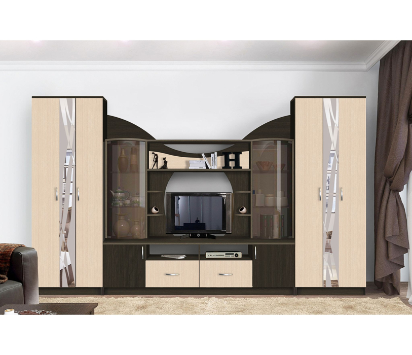 Конструкция комбинированная с тумбой под тв, открытой полкой, витринами с гнутыми стеклами и 2-я шкафами.
