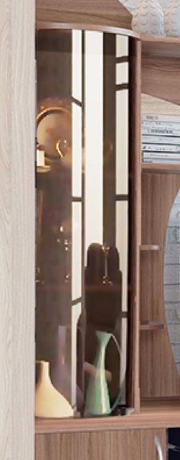 Конструкция комбинированная с тумбой под тв, открытой полкой, витринами с гнутыми стеклами и 2-я шкафами.