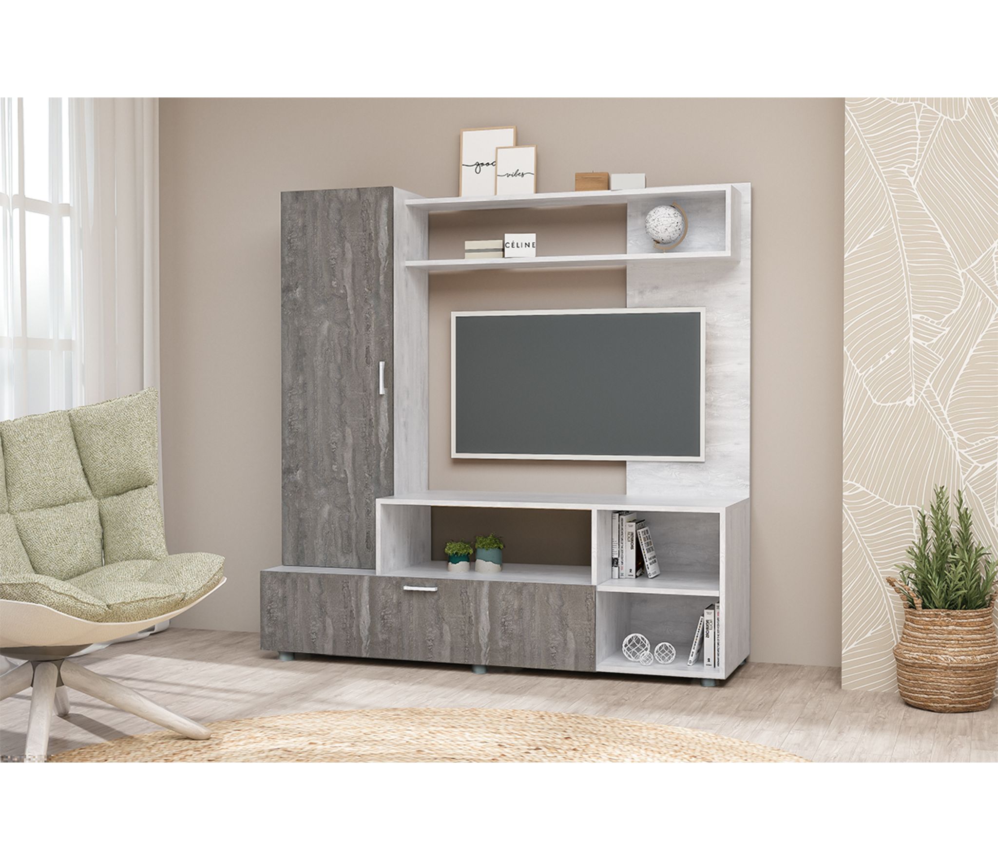 Конструкция комбинированная с тв тумбой, открытыми полками и пеналом.