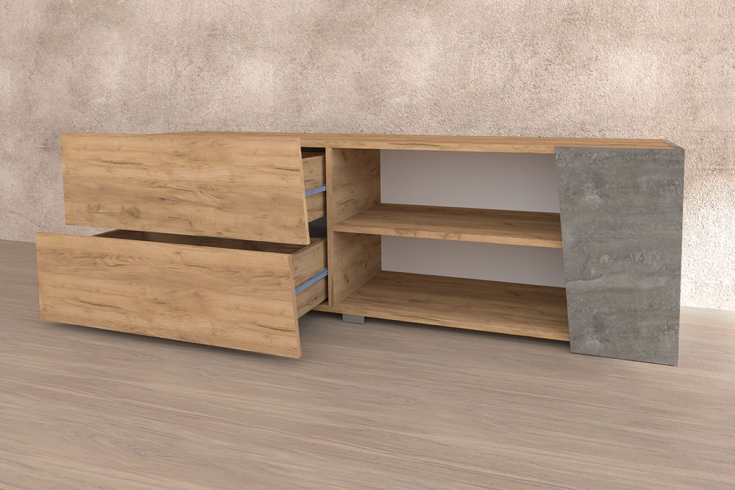Снабжена выдвижными ящиками и удобными нишами