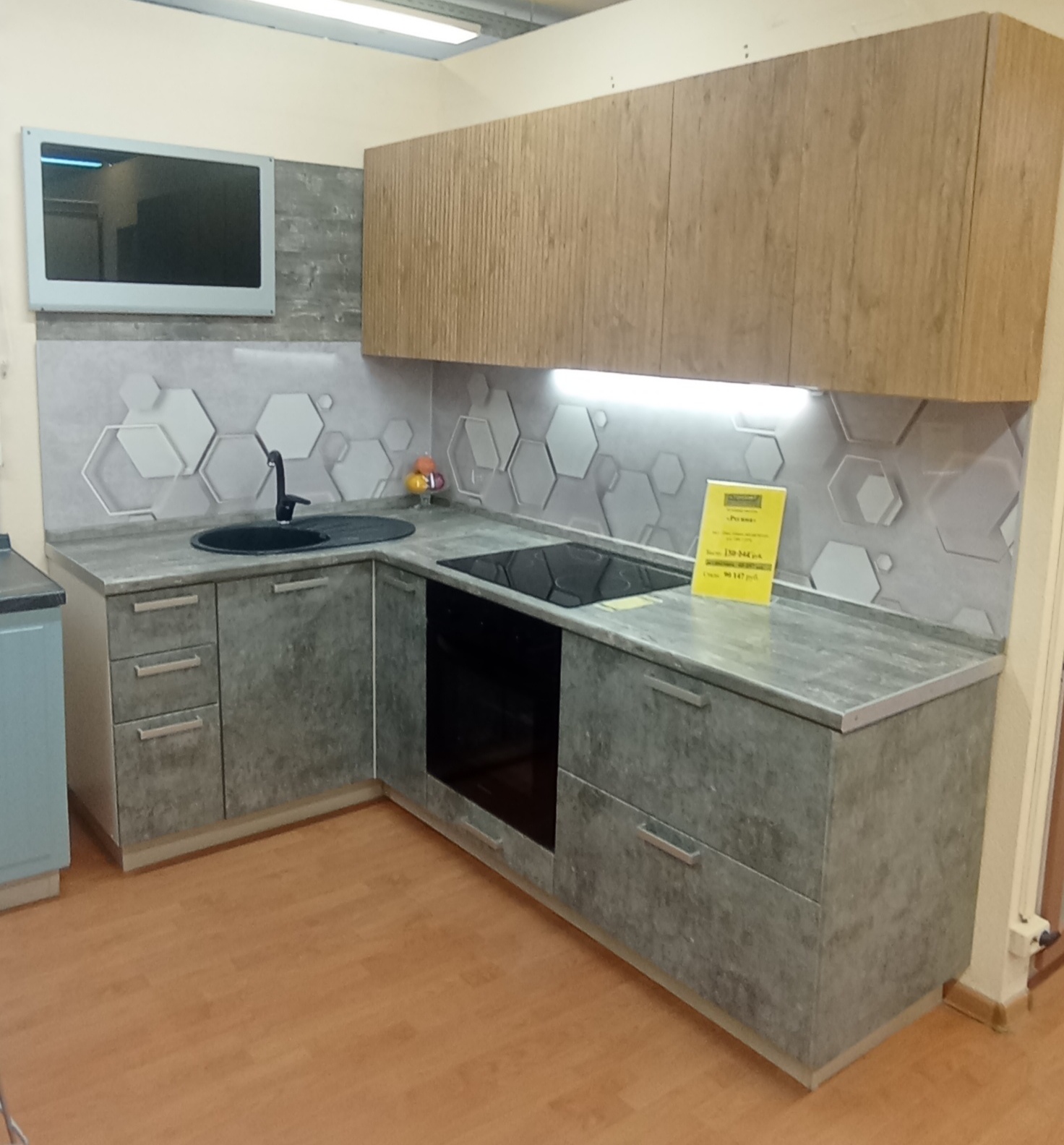 В стоимость данного образца входят столы, полки, фурнитура, столешница и стеновая панель.