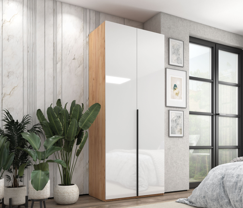 Мебель выполнена в актуальной комбинированной гамме: корпус в цветах Белый и Дуб крафт сочетается с фасадами Белый глянец, что позволяет легко вписать шкафы в светлый современный интерьер и визуально расширить пространство.