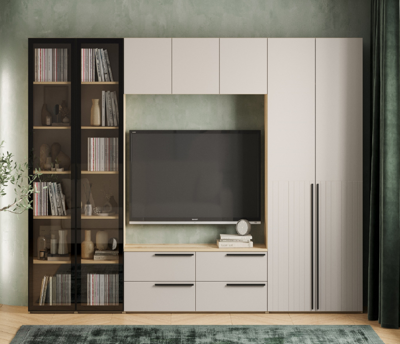 Композиция включает два однодверных шкафа-витрины с полками, тумбу под ТВ с выдвижными ящиками, навесной шкаф-антресоль с распашными дверцами и двухдверный шкаф с полками и горизонтальной штангой.