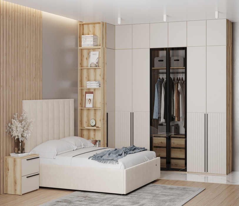Композиция включает стеллаж, однодверные и двухдверные шкафы со множеством полок, ящиками и овальной штангой для организации хранения вещей, а также двуспальную кровать с подъемным механизмом и тумбу прикроватную где можно разместить документы, книги и все необходимые вещи.