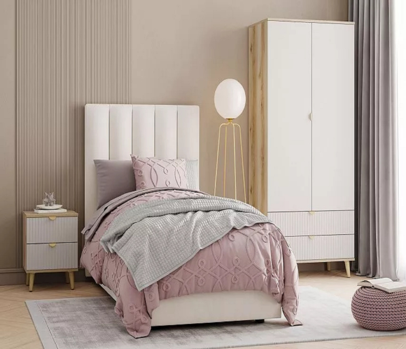 Модульная композиция включает прикроватную тумбу, оснащенную выдвижными ящиками, которые открываются плавно и бесшумно благодаря шариковым направляющим, а в шкафу удобно организовать предметы одежды, при этом высокие опоры облегчают процесс уборки.
