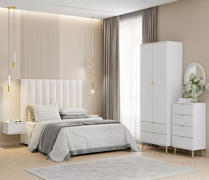 Модульная композиция включает две подвесные прикроватные тумбы и комод оснащенные выдвижными ящиками, которые открываются плавно и бесшумно благодаря шариковым направляющим.