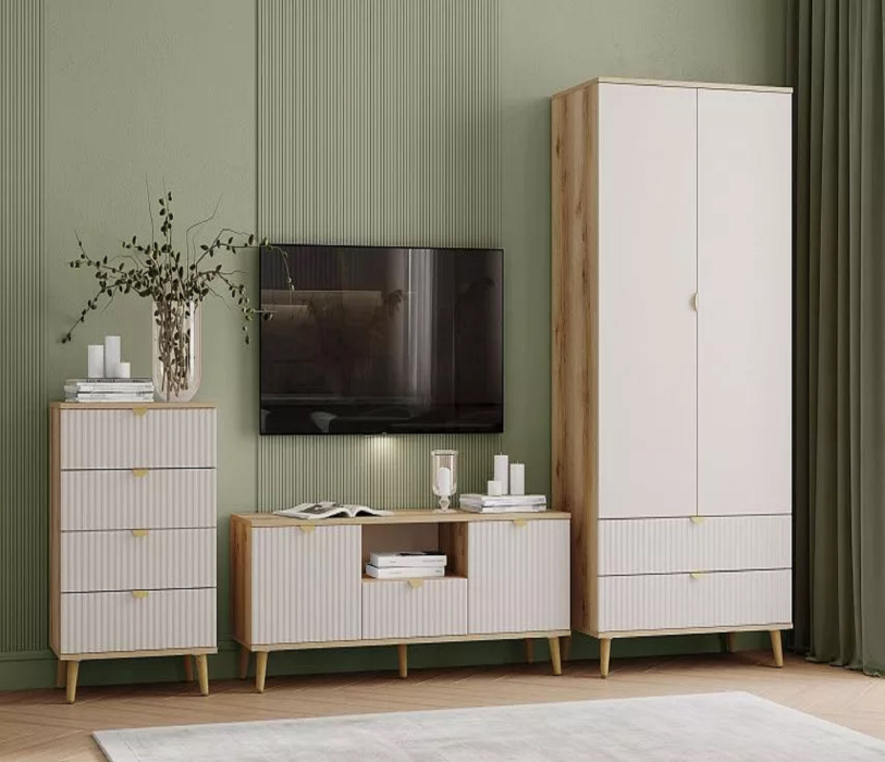 Модульная композиция включает комод оснащенный выдвижными ящиками, которые открываются плавно и бесшумно благодаря шариковым направляющим, тумбу под ТВ с распашными дверцами и ящиком для документов, мелочей и аксессуаров, а так же вместительный шкаф в котором можно удобно разместить одежду, белье и т.д.