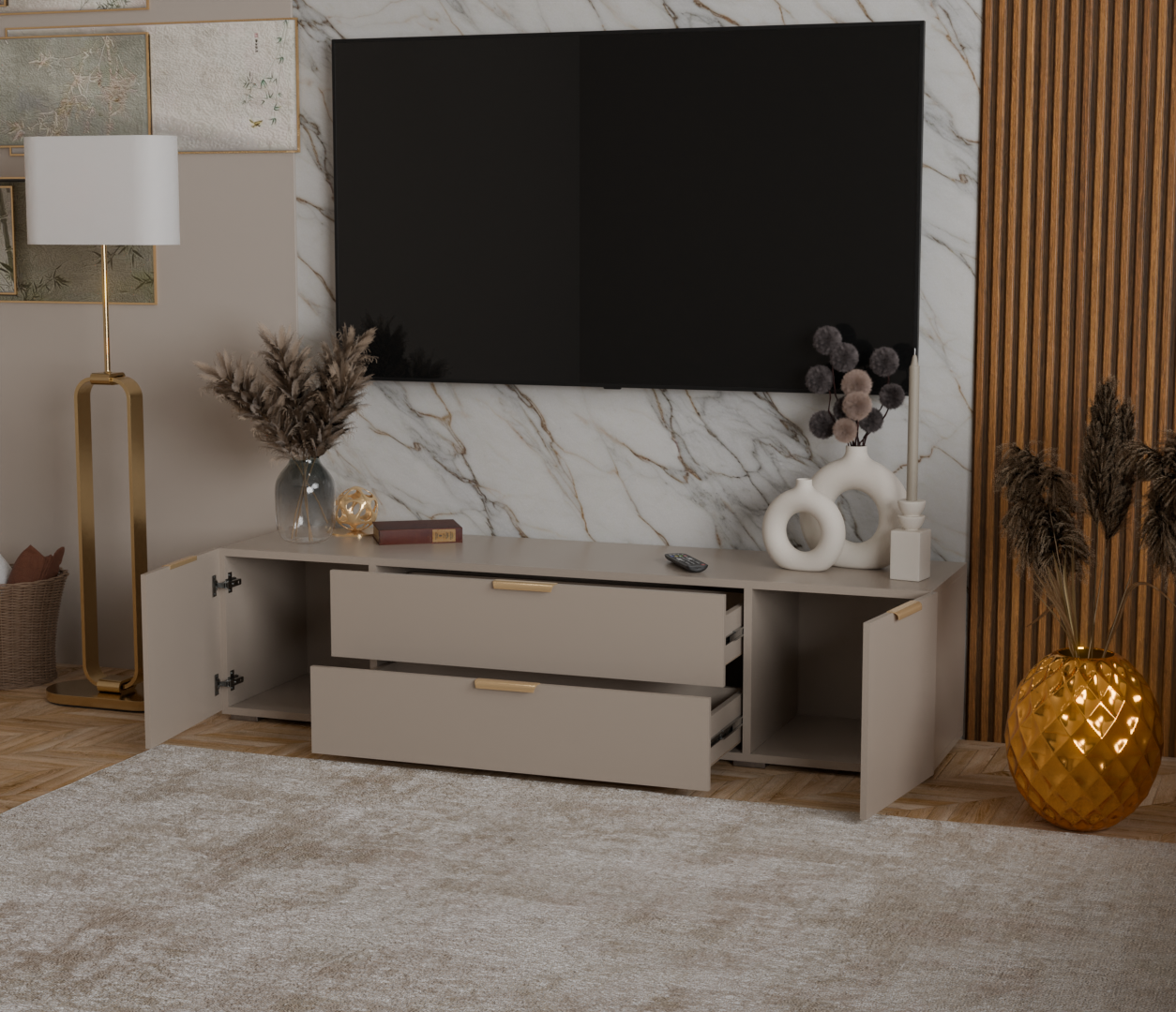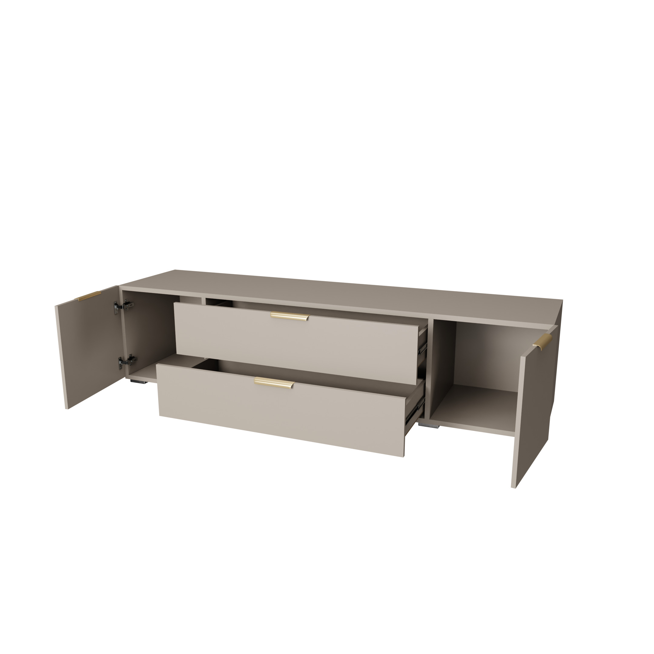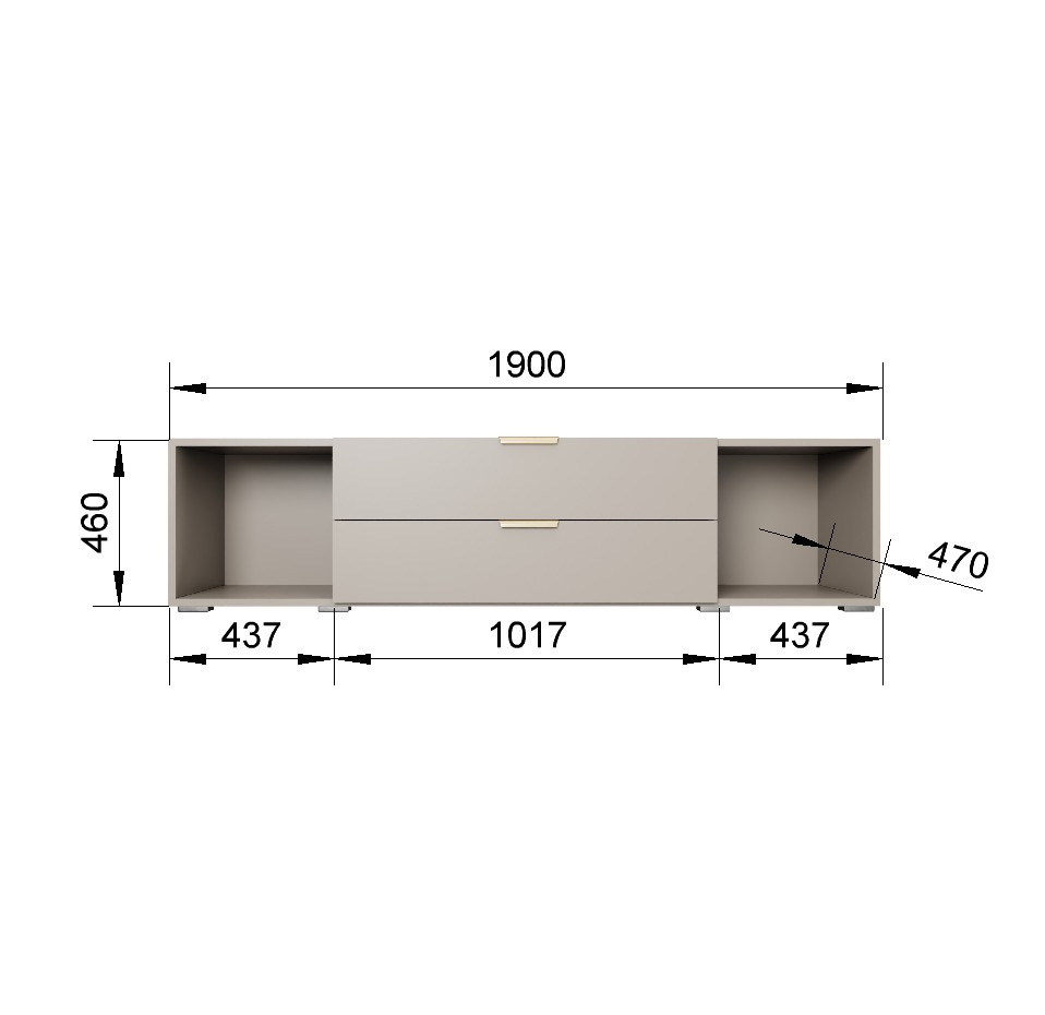 Большая тумба под ТВ 190 см с ящиками и открытыми полками, ЛДСП Кашемир, шариковые направляющие, металлические ручки – стильное и практичное решение для вашей гостиной, которое будет актуально многие годы