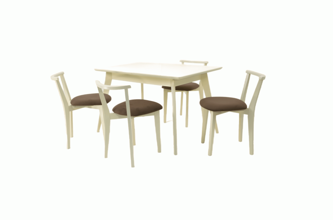 Комплект из деревянного стола Сканди на каркасе из натурального дерева и 4 стула Франк отлично подойдет к интерьеру, выдержанному в скандинавском стиле. Данный комплект станет центральным элементом в гостиной, столовой зоне, на кухне, позволив создать уютное обеденное место, где смогут собираться члены дружной семьи и их гости.У модели прямоугольная форма столешницы, со скруглением углов. Такое решение исключит риск сколов и обеспечит безопасность, в том числе, детям.Комплект выполнен в красивом цвете - слоновая кость. Сочетание изысканного дизайна и высокого качества исполнения - главная особенность комплекта.Столешница выполнена из материалов с великолепными эксплуатационными свойствами - МДФ (Материал создается на основе натуральной древесины. Практичен, надежен, имеет однородную гладкую структуру), шпон.Мебель проста в уходе - для поддержания первозданного вида достаточно использовать простую чуть влажную салфетку по мере необходимости.Состав комплекта: Стол F514100S00 120x80x75 и 4 стула R100709S04 44x53x73