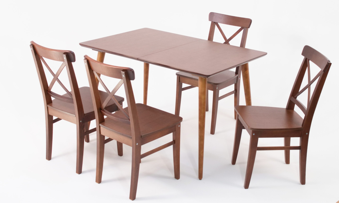 Комплект из деревянного стола Монте на каркасе из натурального дерева и 4 стула Ингольф отлично подойдет к интерьеру, выдержанному в скандинавском стиле. Данный комплект станет центральным элементом в гостиной, столовой зоне, на кухне, позволив создать уютное обеденное место, где смогут собираться члены дружной семьи и их гости.У модели прямоугольная форма столешницы, со скруглением углов. Такое решение исключит риск сколов и обеспечит безопасность, в том числе, детям.Комплект выполнен в красивом цвете - орех. Сочетание изысканного дизайна и высокого качества исполнения - главная особенность комплекта.Столешница выполнена из материалов с великолепными эксплуатационными свойствами - МДФ (Материал создается на основе натуральной древесины. Практичен, надежен, имеет однородную гладкую структуру), шпон.Мебель проста в уходе - для поддержания первозданного вида достаточно использовать простую чуть влажную салфетку по мере необходимости.Состав комплекта: Стол F514135W00 120x80x75 и 4 стула R100742W00 55x43x90