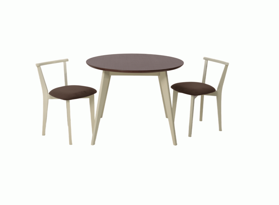 Комплект из деревянного стола Сканди на каркасе из натурального дерева и 2 стула Франк отлично подойдет к интерьеру, выдержанному в скандинавском стиле. Данный комплект станет центральным элементом в гостиной, столовой зоне, на кухне, позволив создать уютное обеденное место, где смогут собираться члены дружной семьи и их гости.У модели круглая форма столешницы. Такое решение исключит риск сколов и обеспечит безопасность, в том числе, детям.Комплект выполнен в красивой комбинации цветов - орех, слоновая кость. Сочетание изысканного дизайна и высокого качества исполнения - главная особенность комплекта.Столешница выполнена из материалов с великолепными эксплуатационными свойствами - МДФ (Материал создается на основе натуральной древесины. Практичен, надежен, имеет однородную гладкую структуру), шпон.Мебель проста в уходе - для поддержания первозданного вида достаточно использовать простую чуть влажную салфетку по мере необходимости.Состав комплекта:- стол F004103SUW- стулья R101709S04