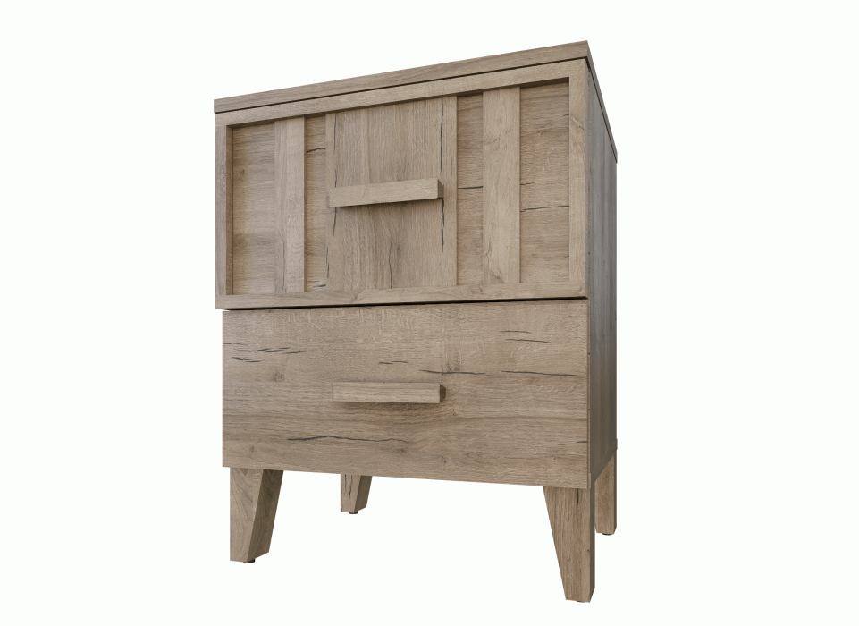 Тумба прикроватная 41 – необходимый предмет мебели в современной спальне, на который возлагаются функции классического прикроватного столика. Опоры со скосом – это не только дизайнерская находка, такое решение позволит без труда делать уборку в Вашей спальне. Два ящика глубиной 300 мм оснащены шариковыми направляющими полного выдвижения, что обеспечивает плавность и бесшумность хода. Рамочный фасад верхнего ящика украшен вертикальными планками разной ширины в цвет основного декора Дуб Серый и ручкой из массива дуба.