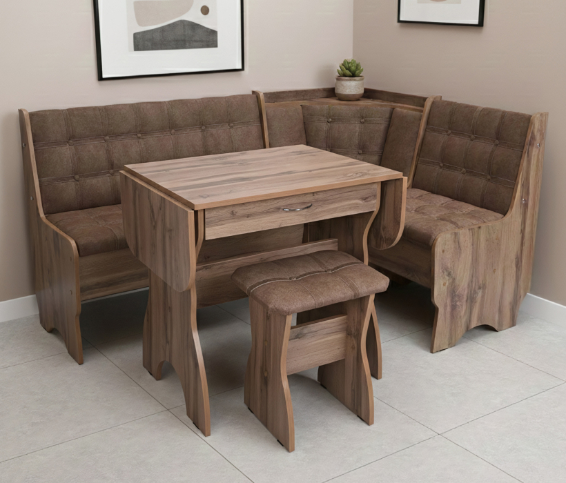 Кухонный уголок состоит из:Дивана углового,Стол-уши с ящиком (размер стола в разложенном виде 60*125.Выс 73.6.С опущенными ушами 60*70).+2 табурета (размер 29*39*45)Изготовлен из ЛДСП.Обивка велюр ,наполнение поролон.Под сидениями дивана есть ящики для хранения.СБОРКА УНИВЕРСАЛЬНАЯ,КАК НА ЛЕВУЮ,ТАК И НА ПРАВУЮ СТОРОНУ!!