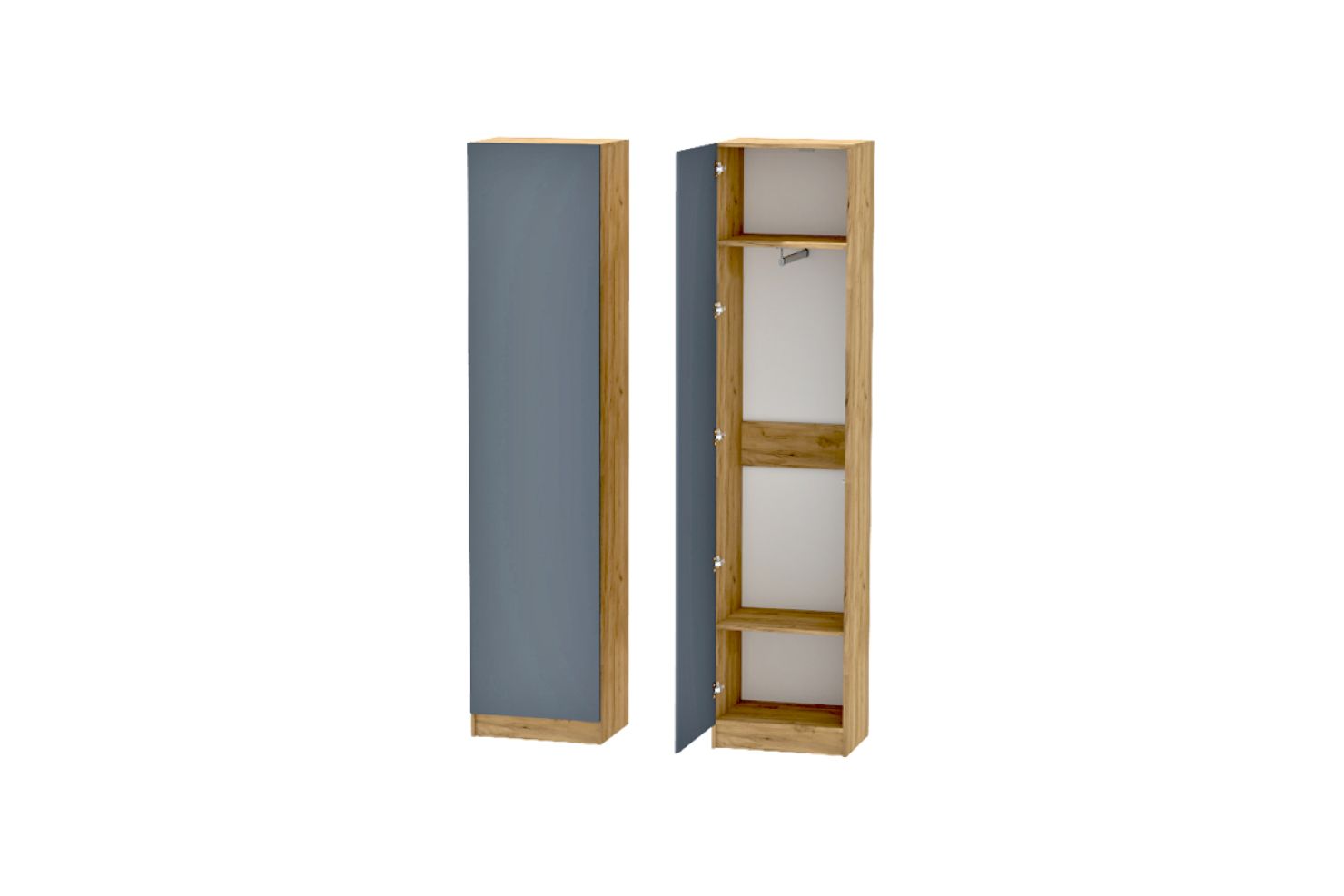 За распашной створкой находятся: две полки и евро штанга для одежды.